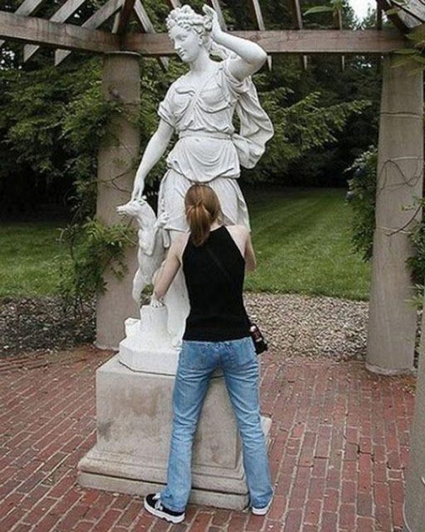 En dan zijn er de vrouwen die de grens van respect naar de absurditeit opzoeken. Sommigen worden zo enthousiast over een standbeeld dat ze het aanraken, ermee poseren of zelfs proberen in een onmogelijke pose te springen, alsof ze echt deel uitmaken van het beeld.