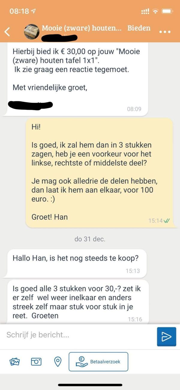 En dan heb je de “echte” marktplaats-experts die de prijzen voor hun spullen extreem hoog houden, maar erbij zeggen dat ze de spullen voor een hogere prijs hebben gekocht en daarom niet verder willen onderhandelen.