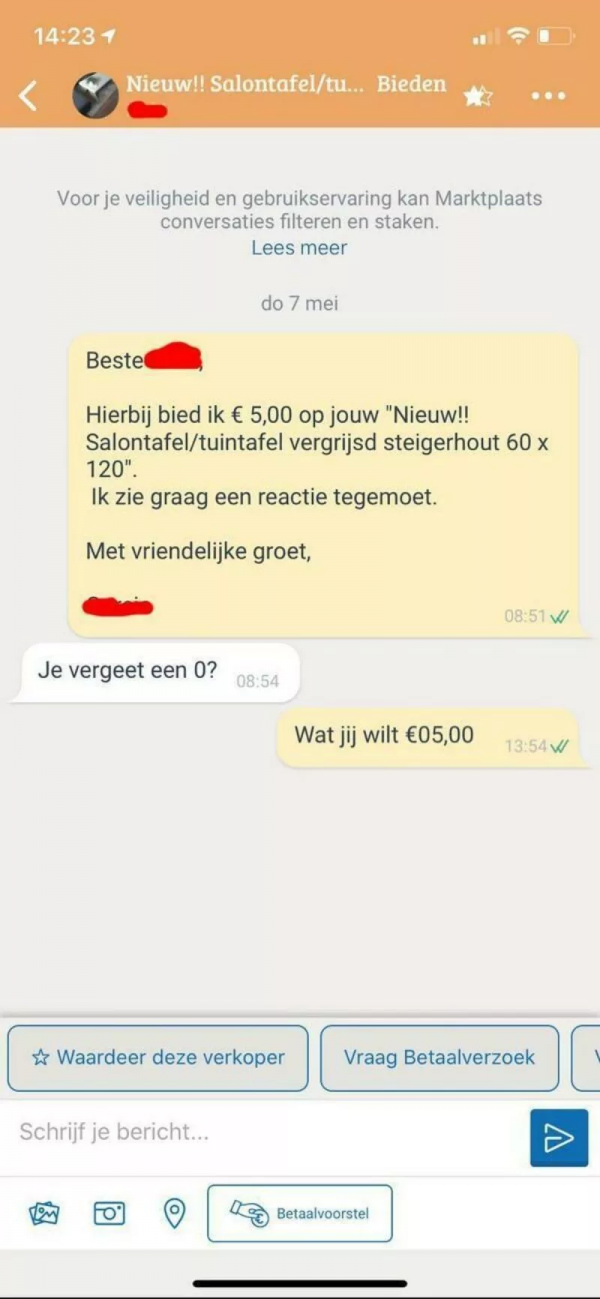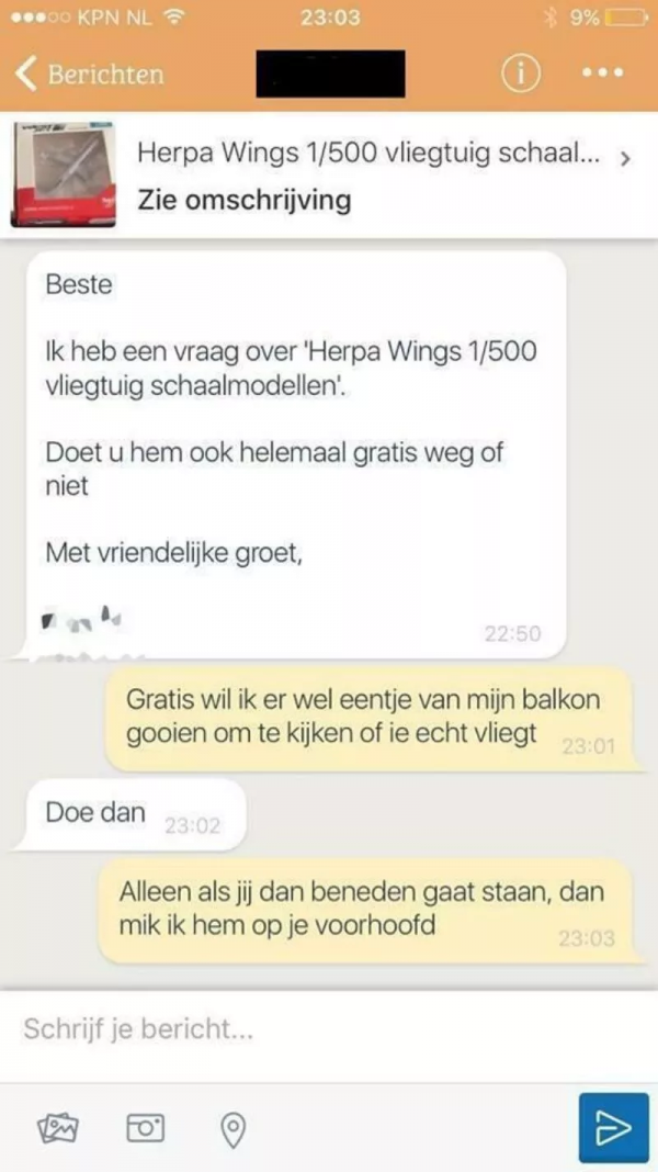 Sommige van deze Marktplaats-gebruikers hebben blijkbaar nooit gehoord van het concept ‘onderhandelen’. Ze maken rare eisen of komen met excuses die je niet kunt geloven. Anderen reageren weer op een manier die zo belachelijk is dat je je afvraagt of ze dit echt menen. Wat het ook is, ze zorgen voor gesprekken die vaak het juiste pad niet vinden.