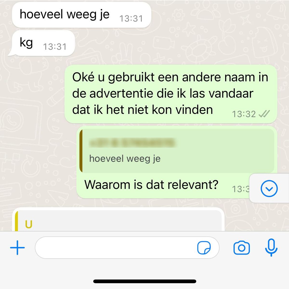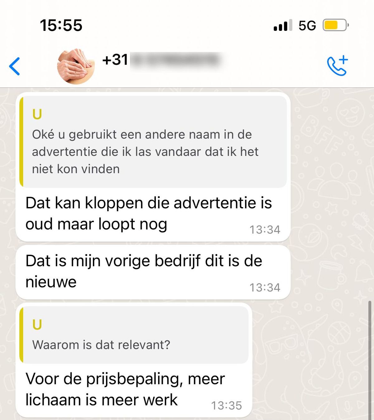 De vrouw besluit verder te vragen naar de exacte prijs en wat haar te wachten staat tijdens de massage. Maar de antwoorden blijven onduidelijk en wat onprofessioneel. Ze vraagt zich af of dit wel serieus is.
