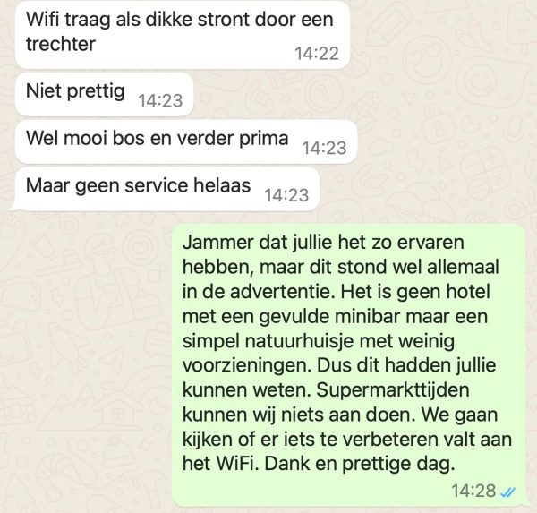Het probleem ontstaat vaak wanneer mensen de naam van het huisje niet goed hebben begrepen of simpelweg niet goed hebben opgezocht wat het concept inhoudt. Het idee van ‘geen voorzieningen’ betekent vaak geen elektriciteit, geen water en geen verwarming, maar sommige gasten gaan ervan uit dat er toch basale gemakken aanwezig moeten zijn. Wanneer ze dit ontdekken, is de teleurstelling groot, en dat leidt vaak tot klachten via WhatsApp, waarin ze aangeven dat ze niet tevreden zijn met hun verblijf……