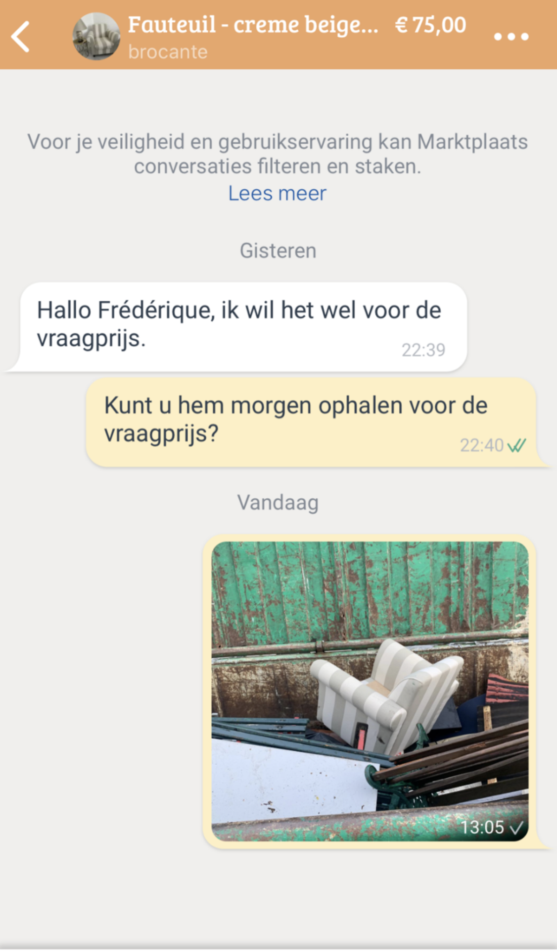 Tot slot was er de gebruiker die een tas aanbood, maar de foto liet duidelijk zien dat deze tas was beschadigd. Toen de koper vroeg of er een korting mogelijk was vanwege de schade, werd hij boos en zei dat hij de tas niet voor minder zou verkopen.