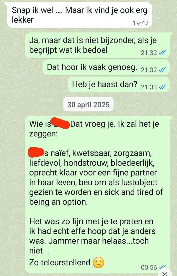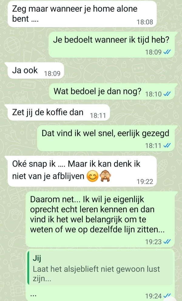 Zijn gesprekspartner lijkt geïnteresseerd, maar hij voelt de druk om de volgende stap te zetten. Hij begint te suggereren dat het misschien tijd is om de date naar een meer intieme setting te brengen……