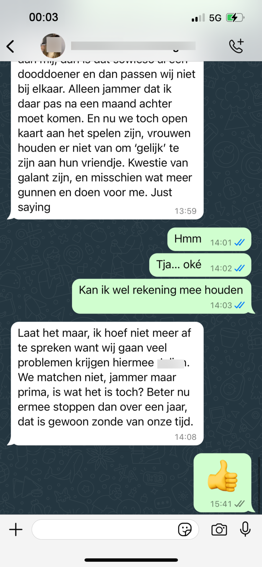 Tom reageerde snel met een nieuwe duim-emoji en een “Haha!” Sophie voelde zich genegeerd en gekwetst. Het was tijd om een punt te maken. “Dit is echt niet wat ik zoek in een gesprek,” besloot ze.