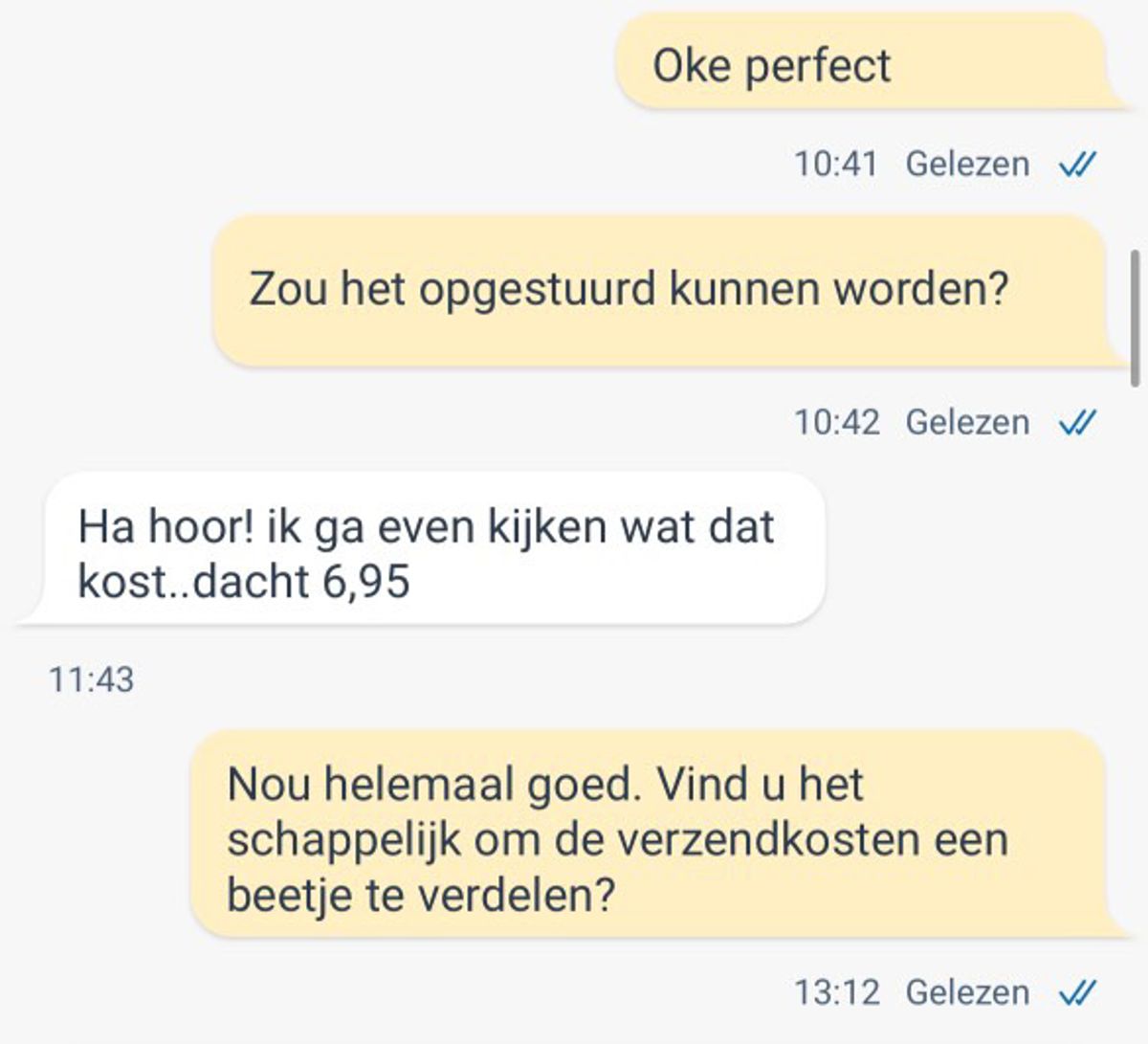 De koper vindt het item dat hij zoekt, maakt een redelijk bod en denkt dat hij snel klaar is. Maar de verkoper komt met een onverwachte vraag: “Is dat inclusief of exclusief verzendkosten?”……