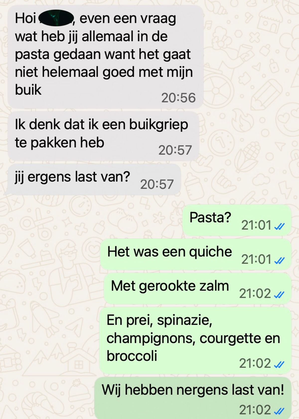 Hysterische schoonzus denkt dat ze buikgriep heeft gekregen van een quiche en komt even verhaal halen op WhatsApp. Het begint allemaal met een simpele maaltijd, een quiche, die ze bij de familie heeft gegeten.