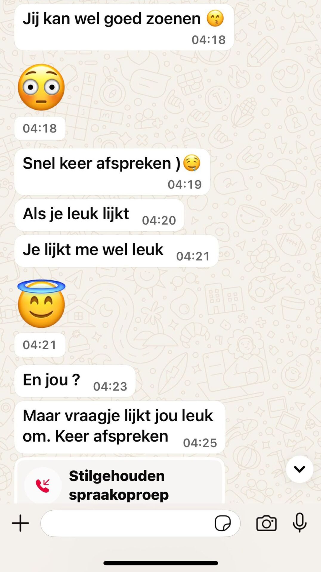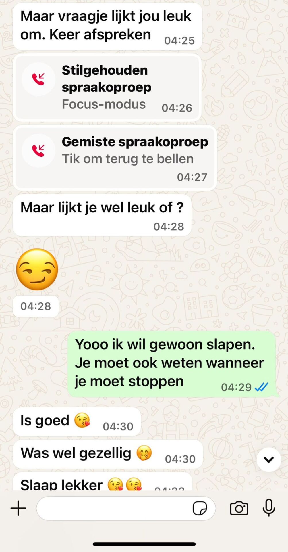Maar na die ene zoen ging het allemaal snel. De jongen, die misschien net zo in het moment leefde, bleef haar volgen, sturen en bellen. Wat aanvankelijk een kort moment van plezier leek, veranderde al snel in een situatie waar ze zich niet meer uit leek te kunnen bevrijden.