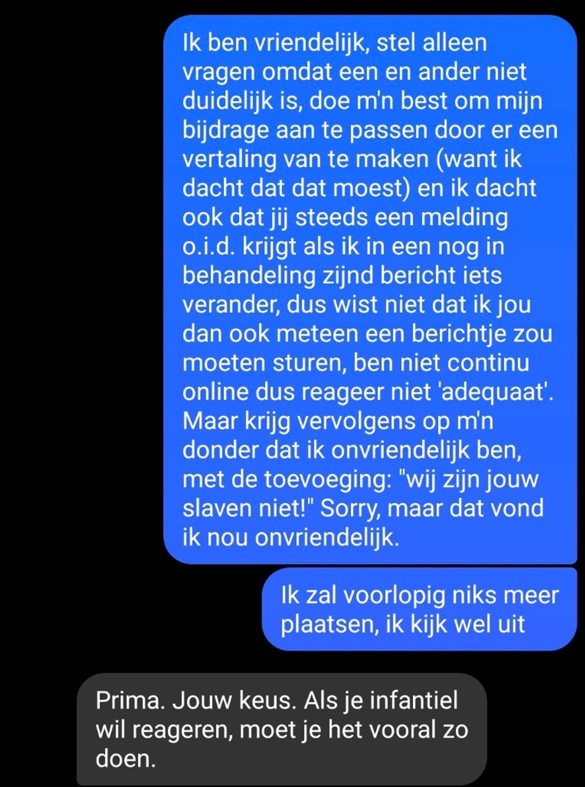 Het werd steeds duidelijker dat de vriend geen begrip had voor het feit dat de jongen misschien even geen tijd had om direct te betalen. De berichten werden steeds meer veroordelend en onbeleefd.