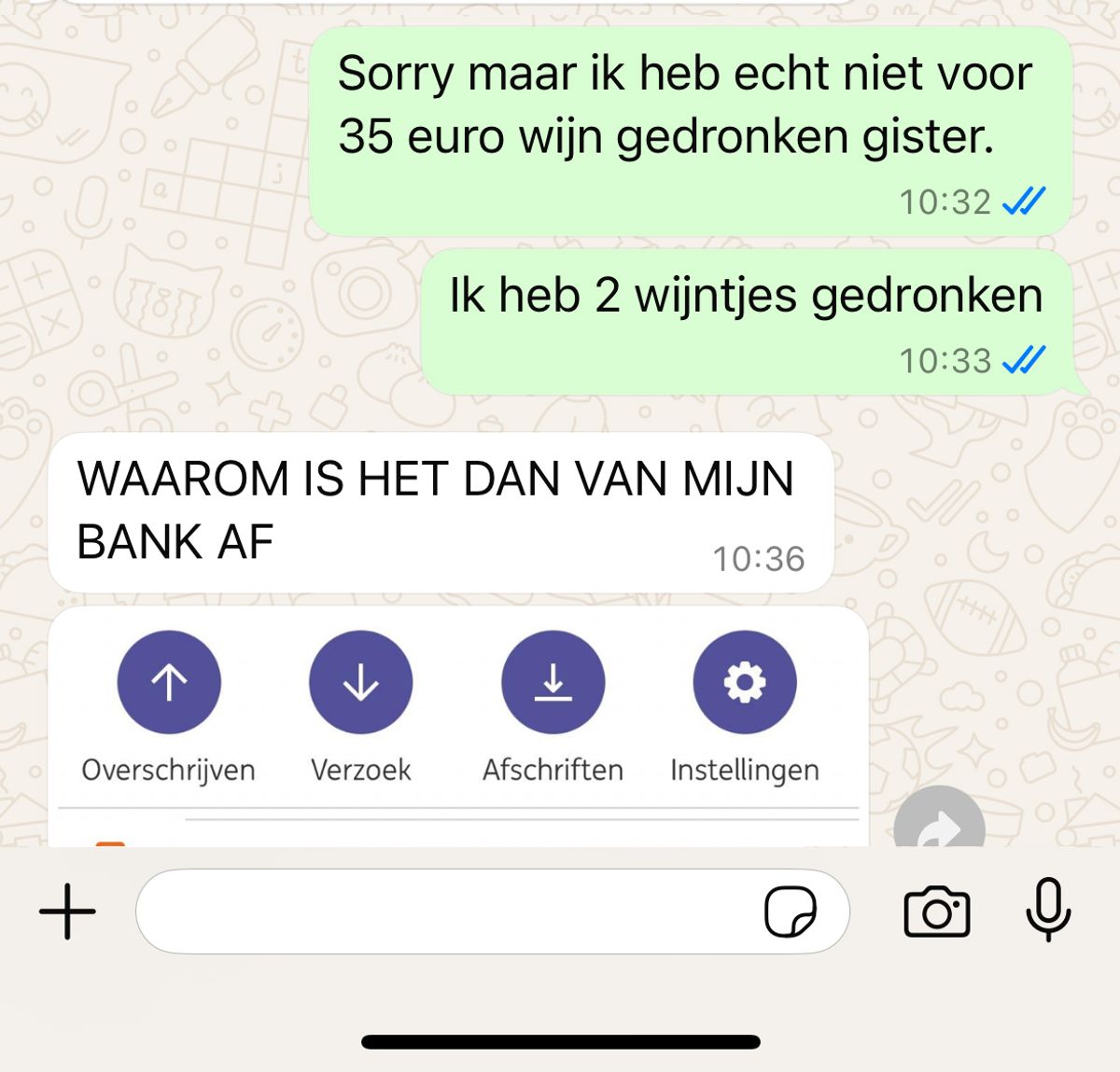 Zijn date reageerde verbijsterd. “Je verwacht geld voor een paar drankjes? We zijn gewoon een keer uitgegaan, dat is wat mensen normaal doen op een date.” Joris bleef echter vasthouden aan zijn standpunt. “Het was een flinke uitgave, en ik heb het je voorgeschoten. Je kunt me gewoon het geld terugstorten, als je wilt dat we het netjes afhandelen.”