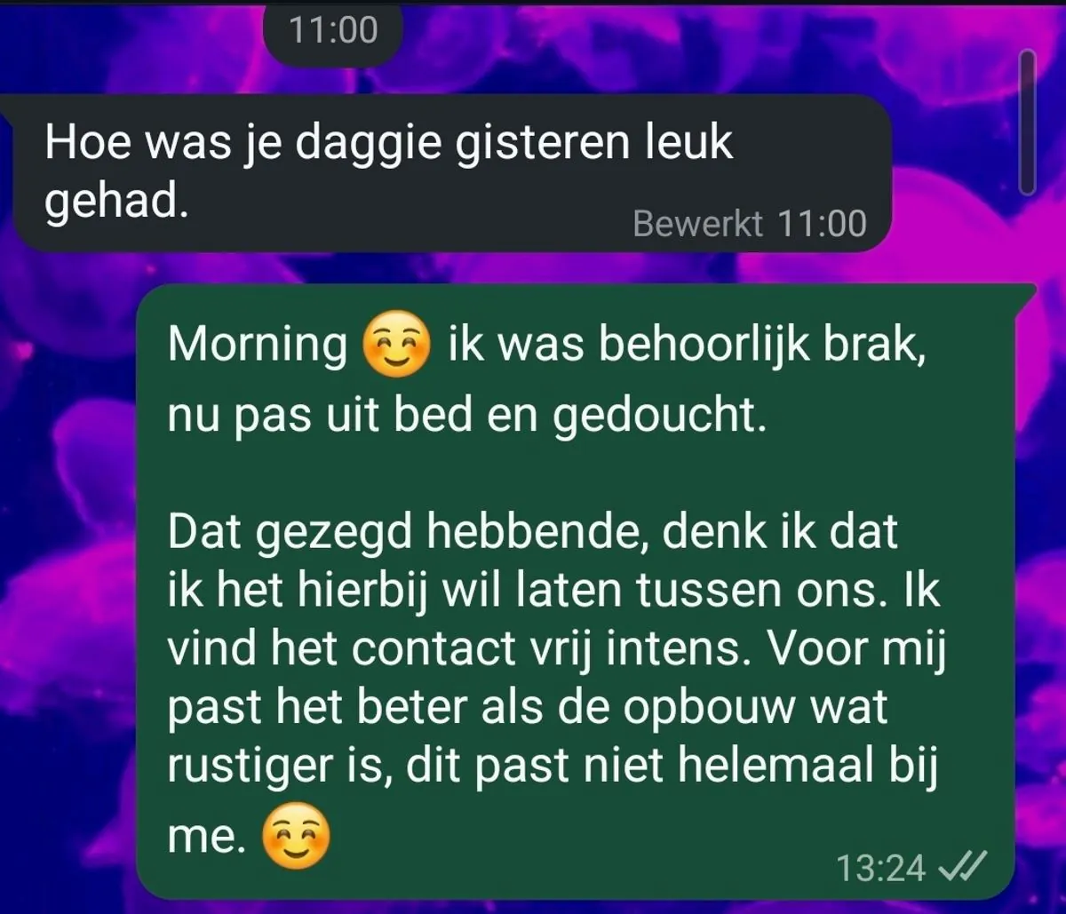 Een man had hoge verwachtingen van zijn eerste date. Het leek een leuke ontmoeting, en hij voelde dat er misschien wel iets zou kunnen groeien. Maar na de date kreeg hij een bericht dat het toch niet was wat ze zocht.