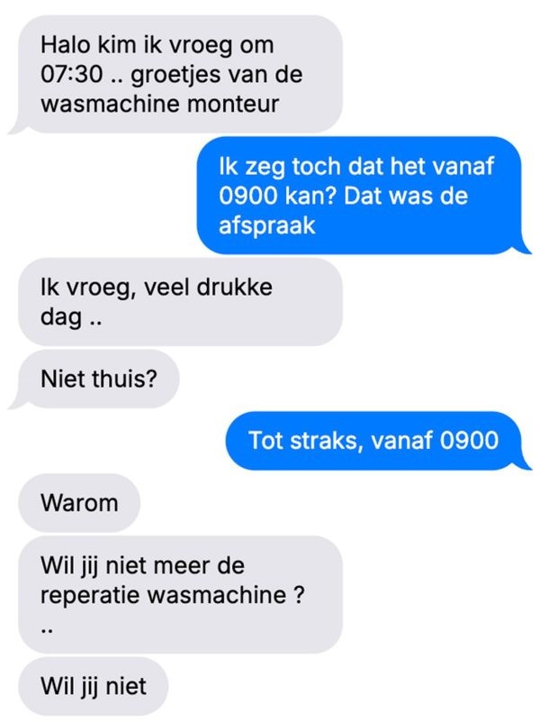 Man die wasmachine komt bezorgen is anderhalf uur te vroeg, wordt boos als er niemand voor hem opendoet