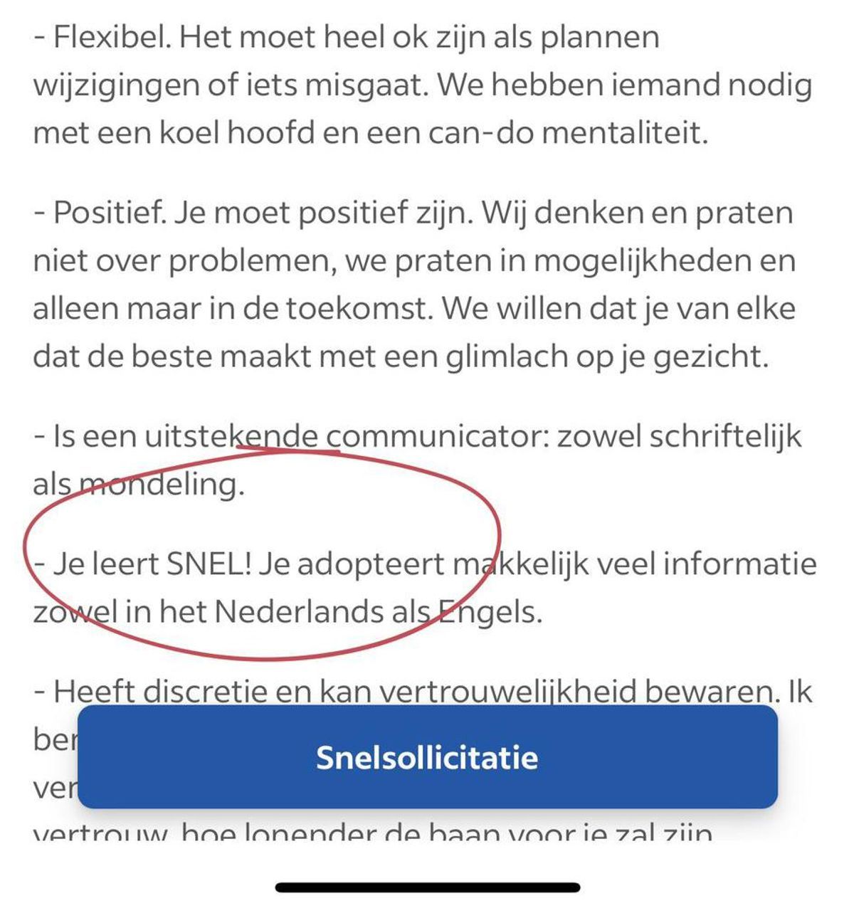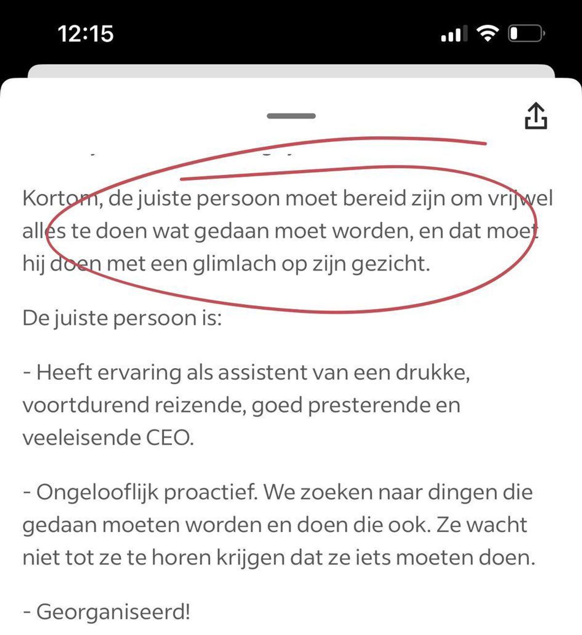 En dan, als kers op de taart: “We willen dat je niet alleen een expert bent in je vakgebied, maar ook het vermogen hebt om 10 mensen tegelijk te managen, elke dag een nieuw project te starten, en in je vrije tijd een wereldreis maakt om innovatieve ideeën op te doen.” Het lijkt wel of ze op zoek zijn naar iemand die letterlijk alles kan doen, op elk moment van de dag.