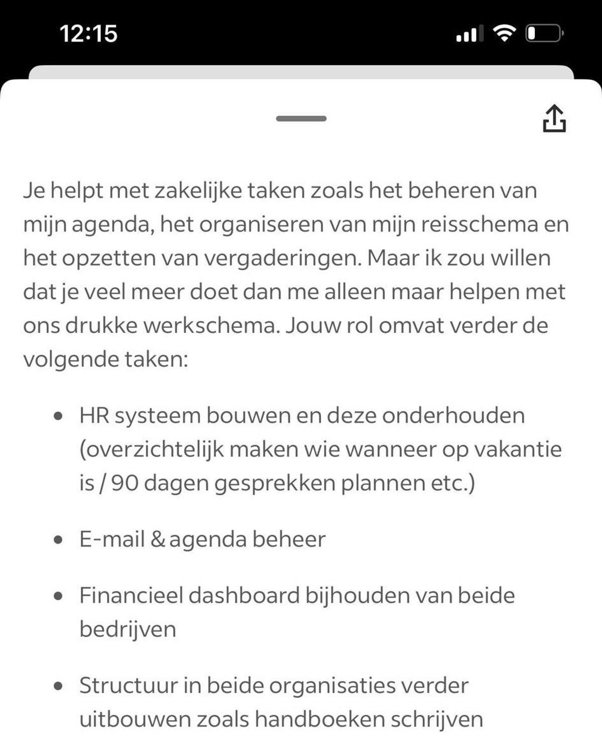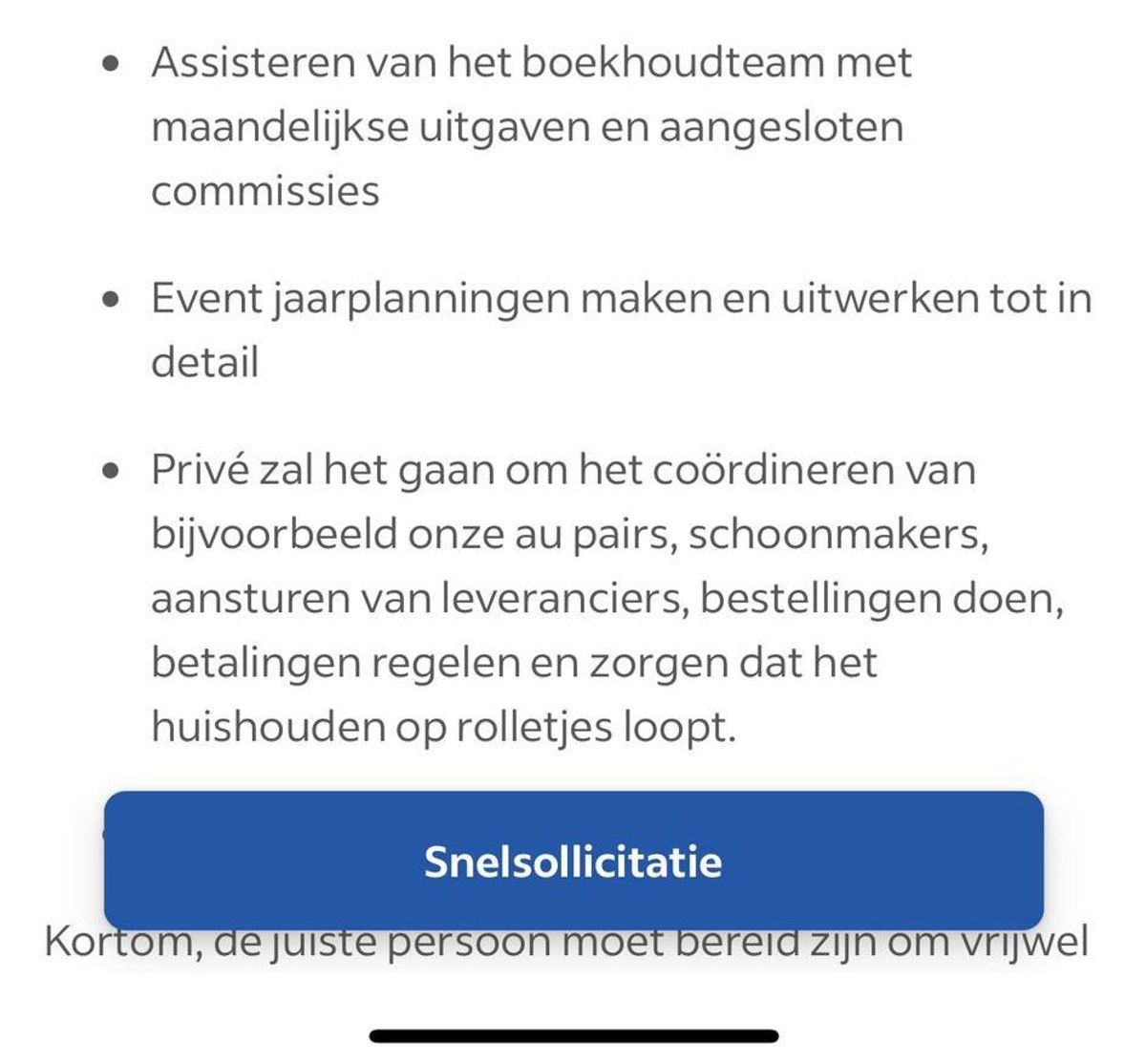 Wat betreft werktijden, wordt de kandidaat geadviseerd: “We verwachten dat je bereid bent om 24/7 beschikbaar te zijn voor ons, maar ook dat je zelf je balans bewaart, je rust neemt wanneer nodig, en nooit jouw energie verspilt aan onbelangrijke zaken.” De paradox is duidelijk: je moet altijd bereikbaar zijn, maar je moet ook zelfzorg toepassen.