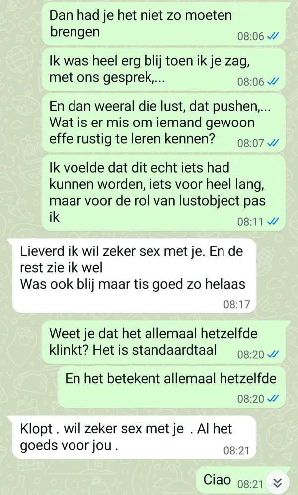 De man biedt zijn excuses aan en probeert de situatie rustig op te lossen, maar het gesprek blijft gespannen. Haar berichten worden steeds korter en feller……