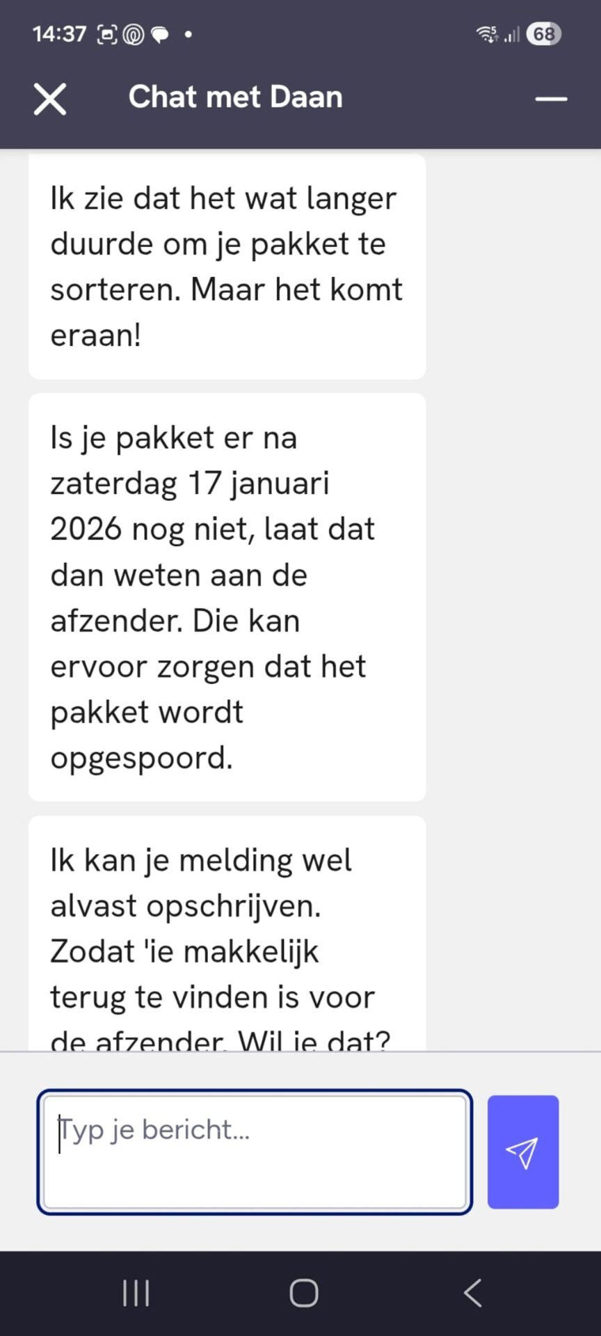 Hier weer een leuk gesprek met de klantenserice van PostNL waar je dus helemaal niks aan hebt