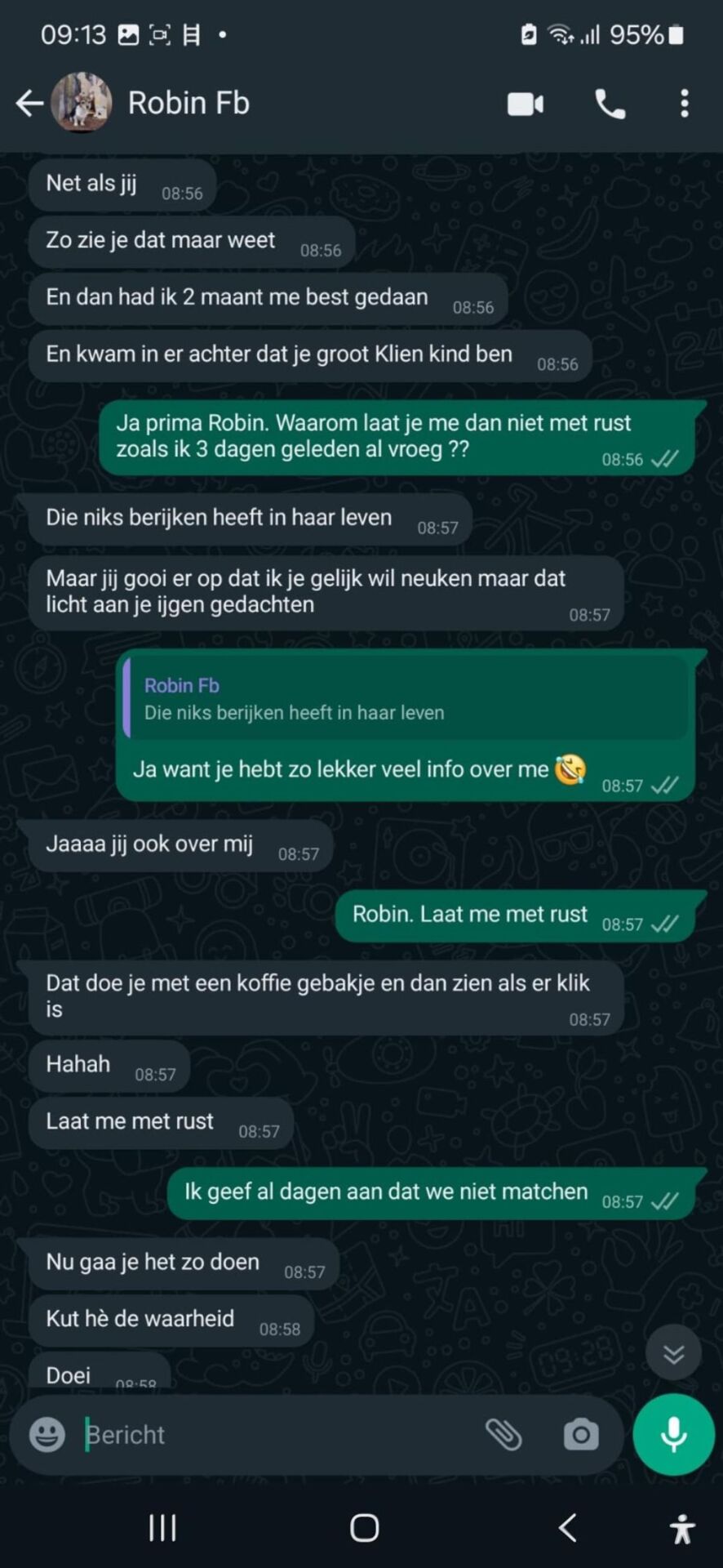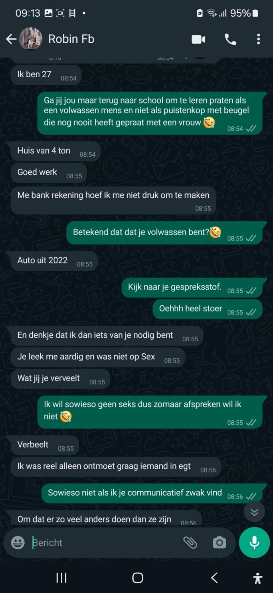 En wat doet iemand als ze zich echt ongemakkelijk begint te voelen? Ze probeert het gesprek met een beetje humor weer op de rails te krijgen. “Ik ben niet het type dat graag details deelt over mijn persoonlijke leven,” zei ze. Maar hij ging verder met: “Dat klinkt als iemand die niet eerlijk is over wat ze zoekt.”