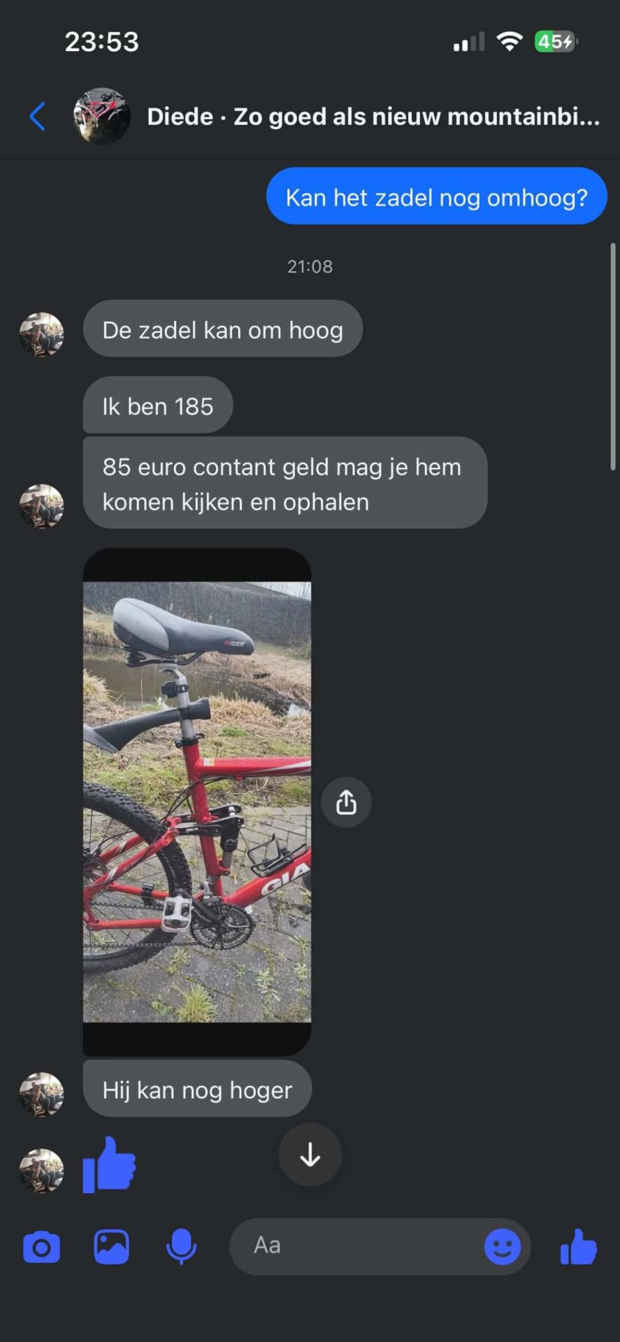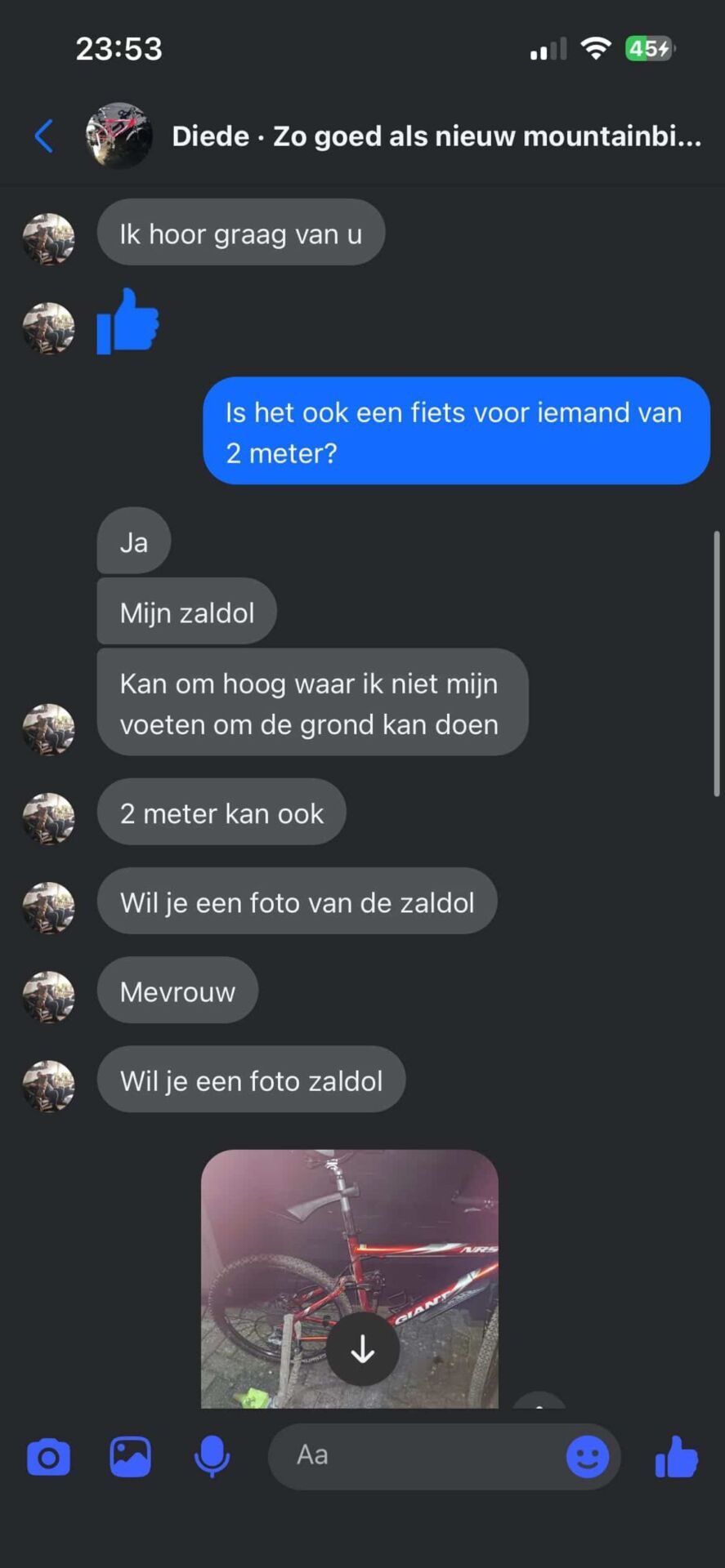 De verkoper stuurde nu een lange boodschap waarin hij gedetailleerd uitlegde waarom deze specifieke mountainbike de beste keuze was. “Je gaat niet geloven hoe goed de vering is op deze fiets, en de banden zijn echt van topkwaliteit. Dit is geen gewone fiets, dit is echt een gouden vondst!”