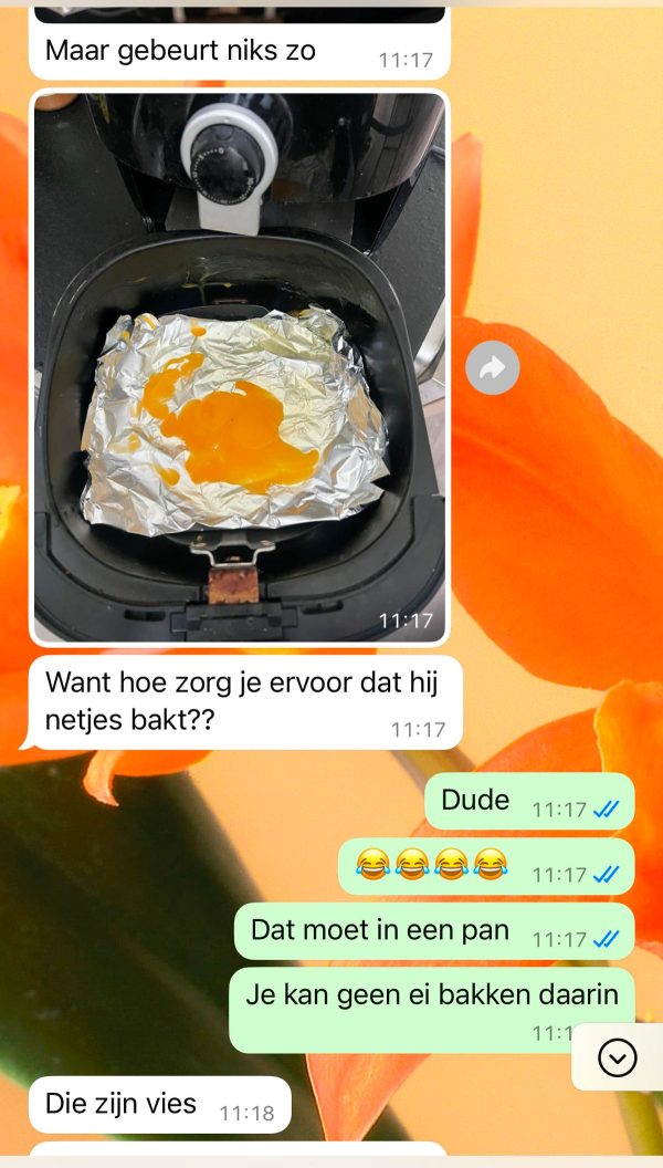 De belangrijkste les die hij leerde? Een airfryer is geen vervanger voor een pan als het gaat om bakken. Hoewel het mogelijk is om een ei in een airfryer te bereiden, moet je het in een kleine ovenbestendige schaal of bakvorm plaatsen om te zorgen dat het ei goed kan garen. Het resultaat zou veel beter zijn geweest als hij dat van tevoren had geweten. Toch was de ervaring voor hem leerzaam: voor het eerst alleen thuis en meteen geconfronteerd met de realiteit van koken zonder toezicht. …….