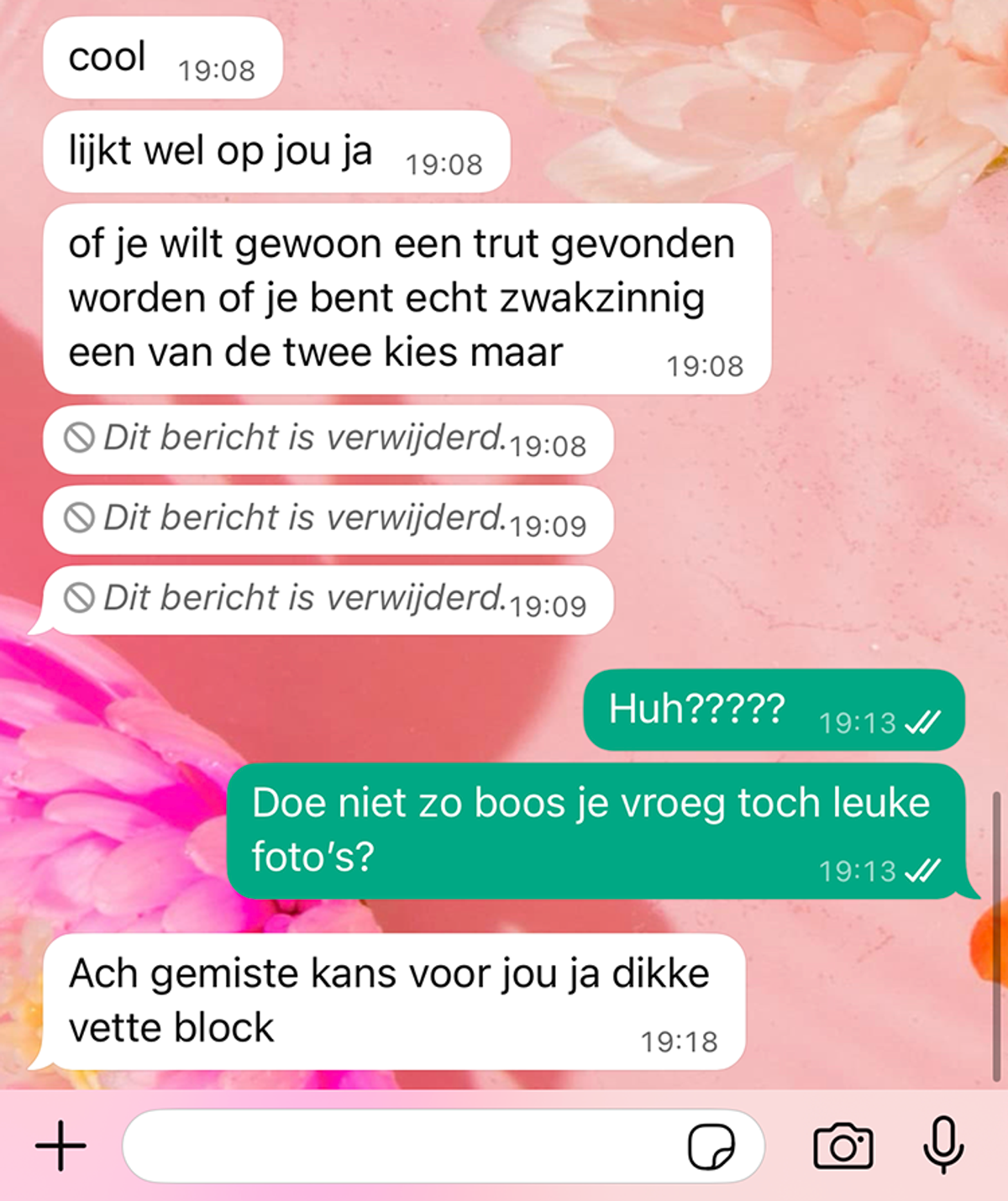 De jongen begon zich af te vragen waarom de vrouwen hem geen foto’s stuurden. “Ben je bang dat ik je niet aantrekkelijk zal vinden?” vroeg hij een keer, blijkbaar nog steeds niet doorhebben dat zijn houding misschien wel de oorzaak was van zijn mislukte pogingen.