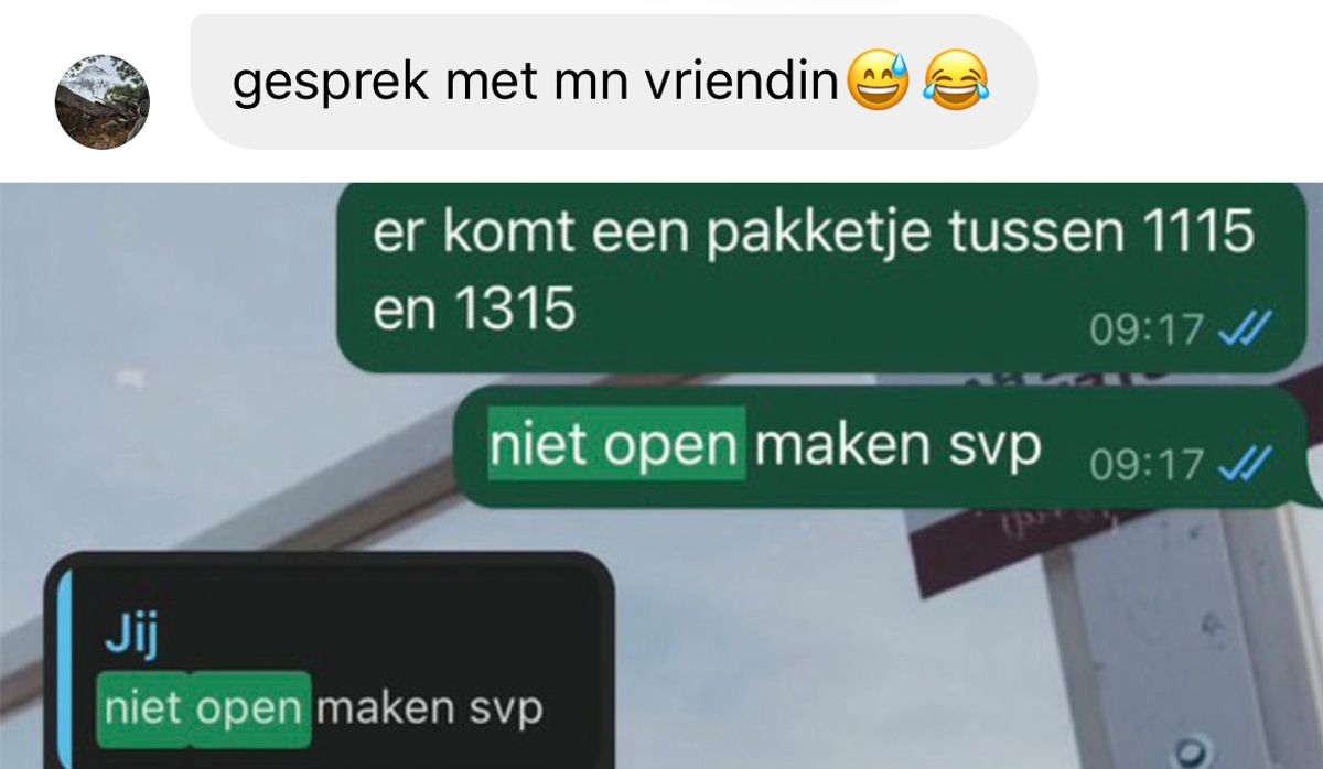 Een jongen heeft een pakketje besteld bij PostNL en is er erg nieuwsgierig naar. Het probleem? Hij wil absoluut niet dat zijn vriendin het pakketje opent voordat hij het zelf doet.