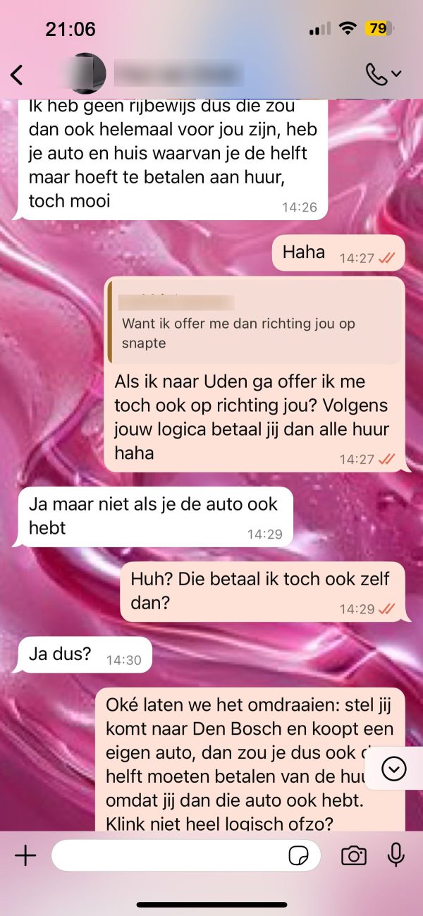 De jongen legt uit dat hij momenteel geen werk heeft, en dat het voor hem niet mogelijk is om de huur te betalen. Hij denkt dat het geen probleem is, aangezien ze toch samen zijn en hij op andere manieren zou kunnen bijdragen, bijvoorbeeld met huishoudelijke taken en emotionele steun.
