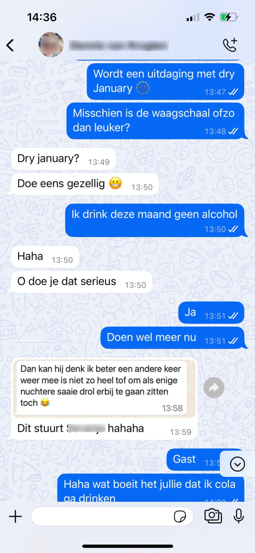 Hoewel het idee van Dry January voor velen een gezonde uitdaging is, werd het voor deze man het begin van een maandlange ban uit zijn vriendengroep. Zijn vrienden begrepen zijn keuze niet en besloten dat hij tijdelijk ‘uit de club’ moest worden gezet. Wat begon als een persoonlijke beslissing over zijn gezondheid, leidde al snel tot humoristische maar ook ongemakkelijke situaties binnen zijn sociale kring……