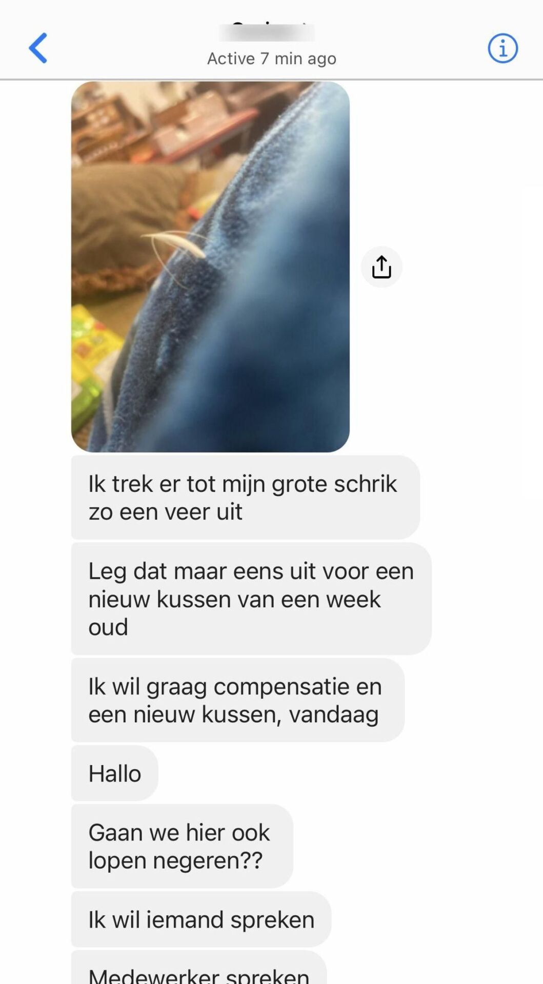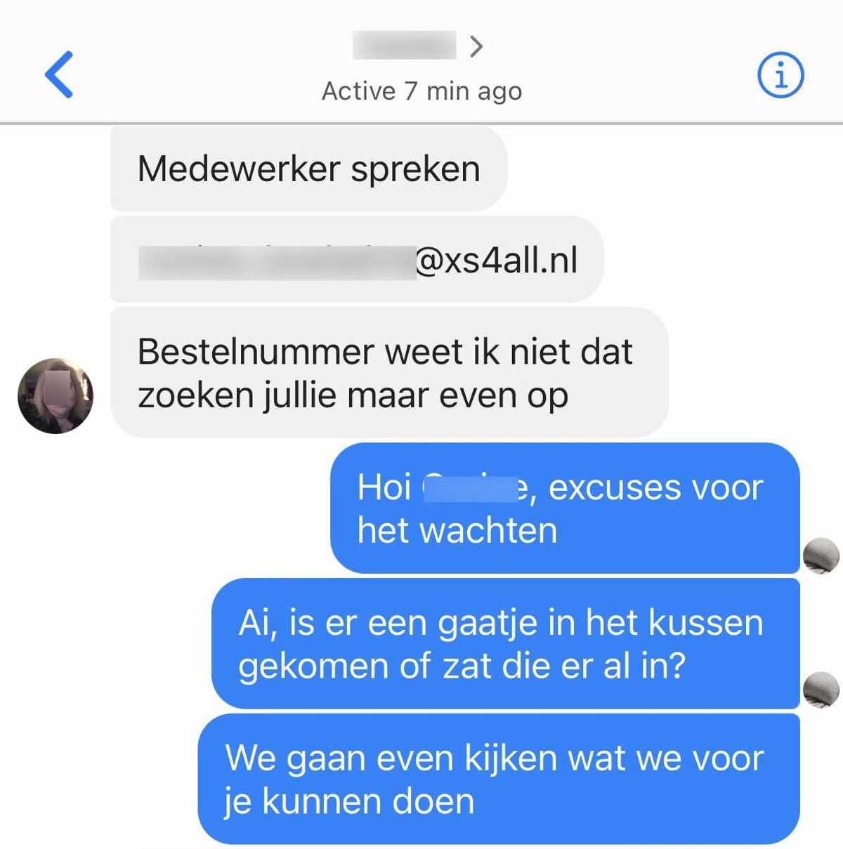 De klantenservice reageerde snel, maar op een beleefde en diplomatieke manier. Ze legden uit dat het gaatje een fabrieksfout kon zijn en boden aan om haar het kussen kosteloos te vervangen. Ze vroegen haar om een foto van het defecte kussen te sturen, zodat ze het proces konden versnellen.