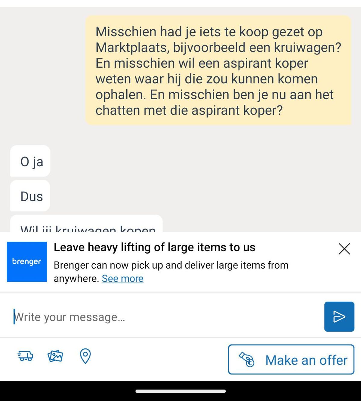 Het begon allemaal toen de man een kruiwagen op Marktplaats zag staan voor een redelijke prijs. Zijn interesse was gewekt en hij besloot de verkoper een bericht te sturen. Maar wat in eerste instantie een eenvoudige koop leek te worden, ontspoorde al snel.