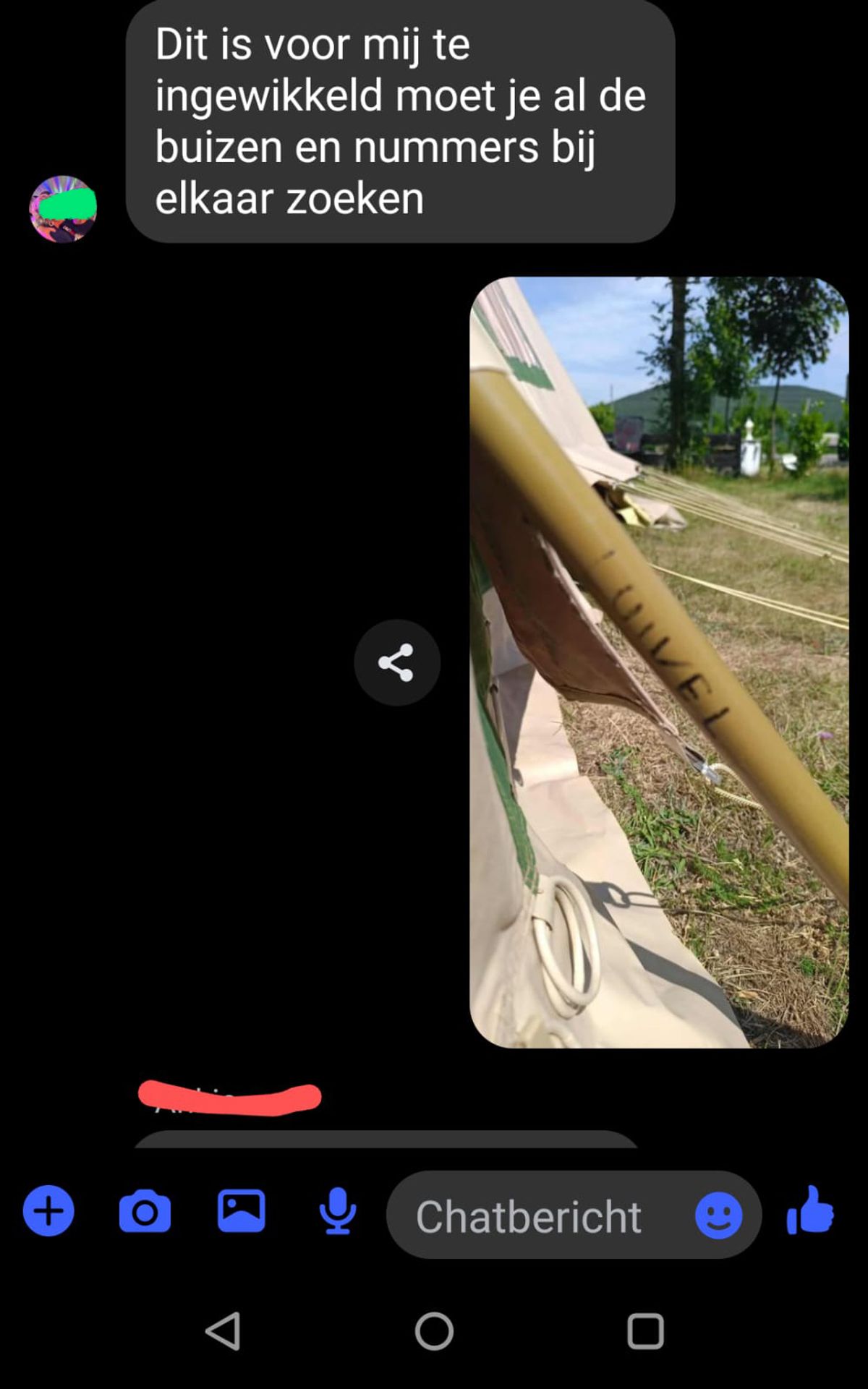 “Waarom is dit zo moeilijk? Dit kan toch niet zo lastig zijn?” denkt ze, terwijl ze probeert een deel van de tent op te zetten……