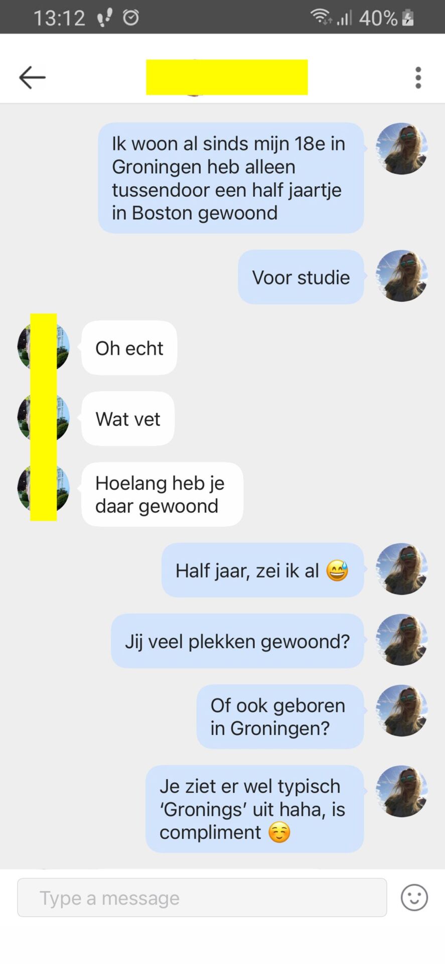 Lompe Groninger in de dating-app is niet echt goed in het voeren van gesprekken en weet ook niet wat Thaise curry is!