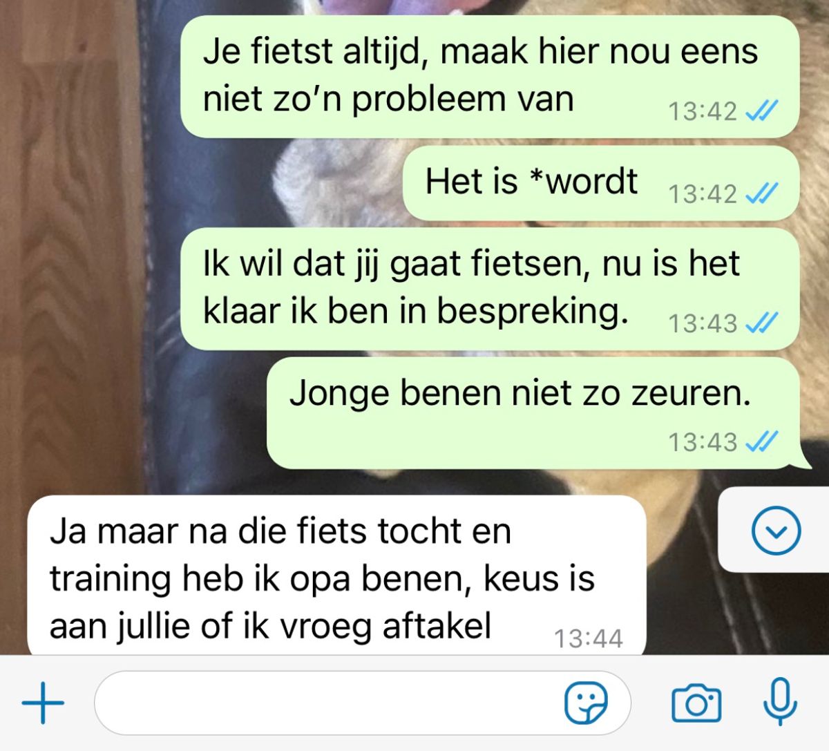 Luie puberzoon wil niet met de fiets naar voetbaltraining omdat zijn benen anders te snel aftakelen