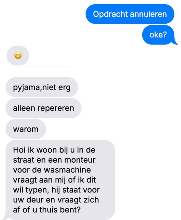Man die wasmachine komt bezorgen is anderhalf uur te vroeg, wordt boos als er niemand voor hem opendoet