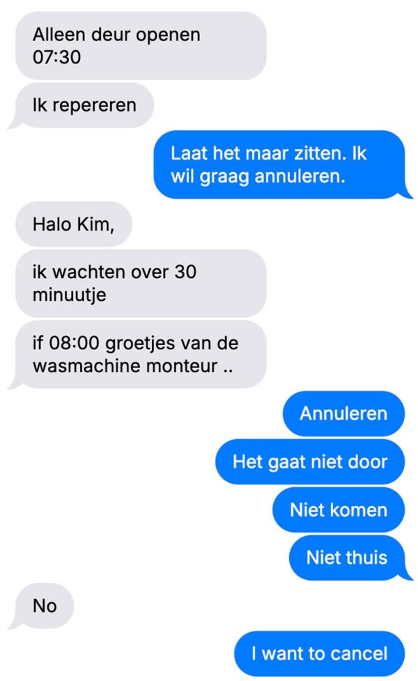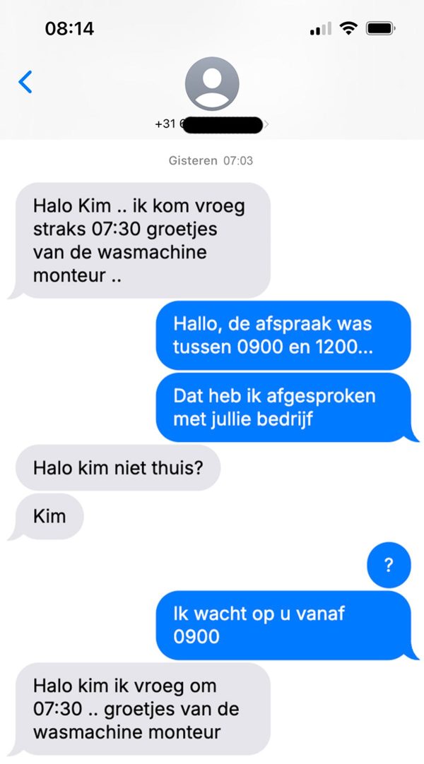 Man die wasmachine komt bezorgen is anderhalf uur te vroeg, wordt boos als er niemand voor hem opendoet