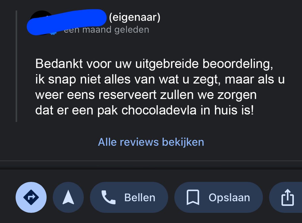 Man is teleurgesteld in restaurant omdat ze geen chocoladevla hebben en maakt deze review waar geen touw aan vast te knopen is