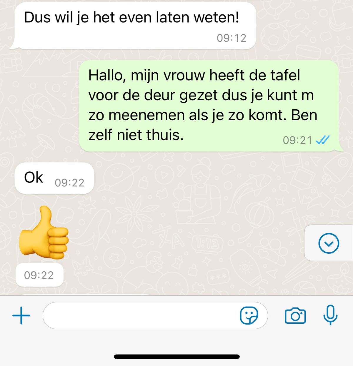 De verkoper zuchtte, maar besloot toch vriendelijk te blijven. “Ik begrijp het, maar dit komt niet echt professioneel over. Volgende keer kun je beter een tijd doorgeven waar je je ook echt aan kunt houden.”