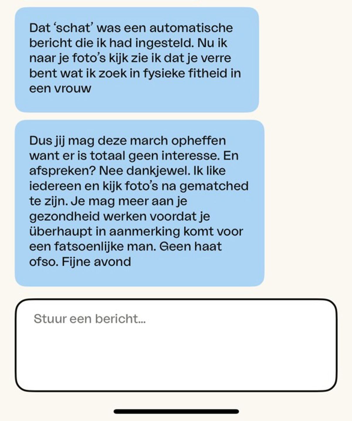 Man kan het niet hebben dat hij geen ‘hey schat’ mocht sturen en gaat direct los in de chat