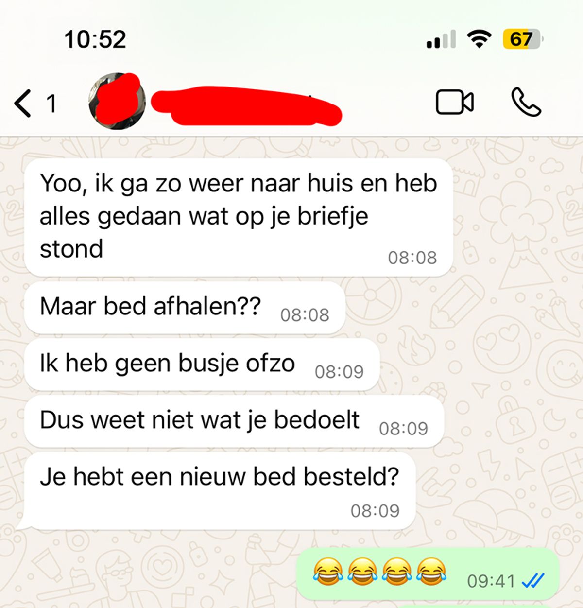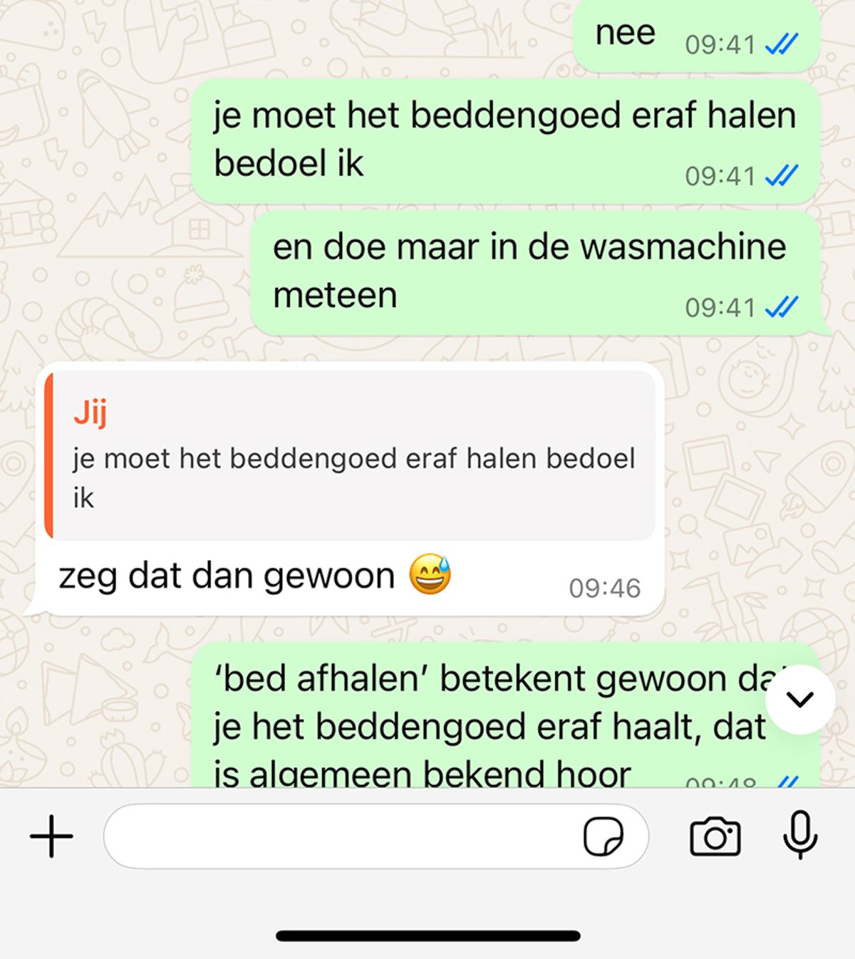 Voordat ze vertrekt, geeft zijn zus hem enkele huishoudelijke instructies, waaronder een opmerking over het afhalen van het beddengoed. “Vergeet niet om het bed af te halen als je klaar bent met slapen,” zegt ze. Het lijkt een eenvoudige taak, maar de man heeft niet helemaal door wat dit precies inhoudt…
