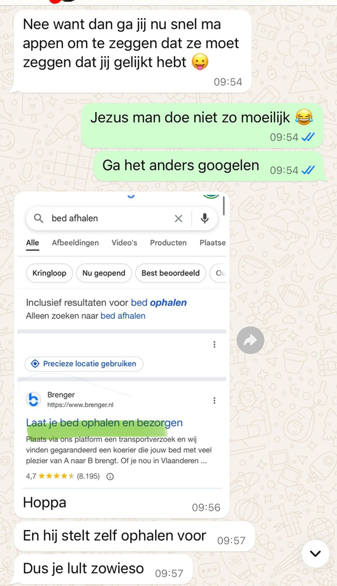 niet alleen afhalen!” De man kijkt haar verbaasd aan. Hij had echt
