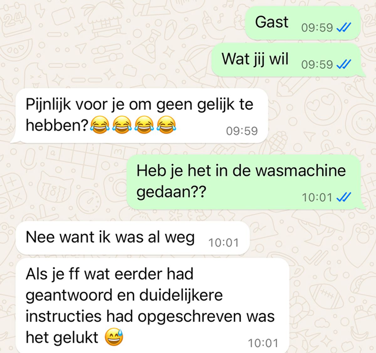 verbaasd. “Maar ik bedoelde dat je het echt in de was moest doen,