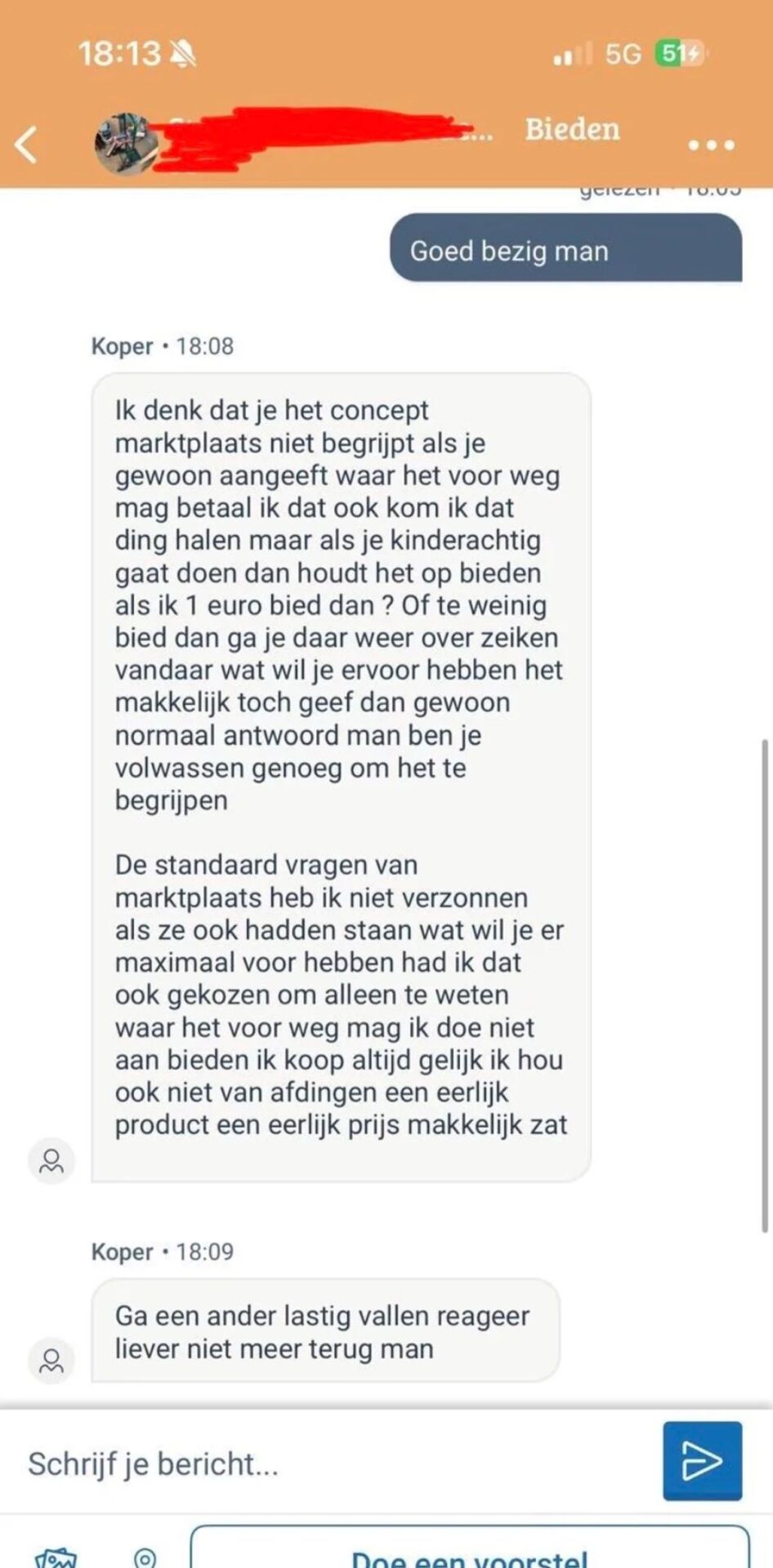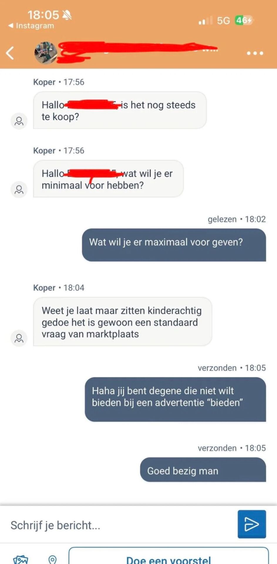Man snapt niet helemaal hoe bieden op Marktplaats werkt en schiet meteen helemaal uit z’n slof als de verkoper vraagt wat hij er maximaal voor wil geven!