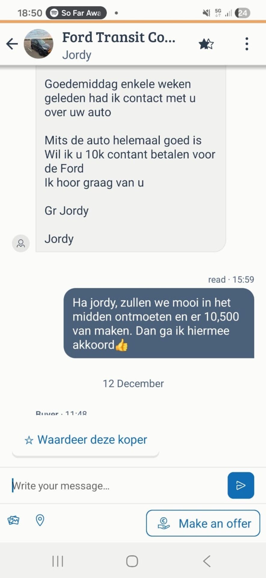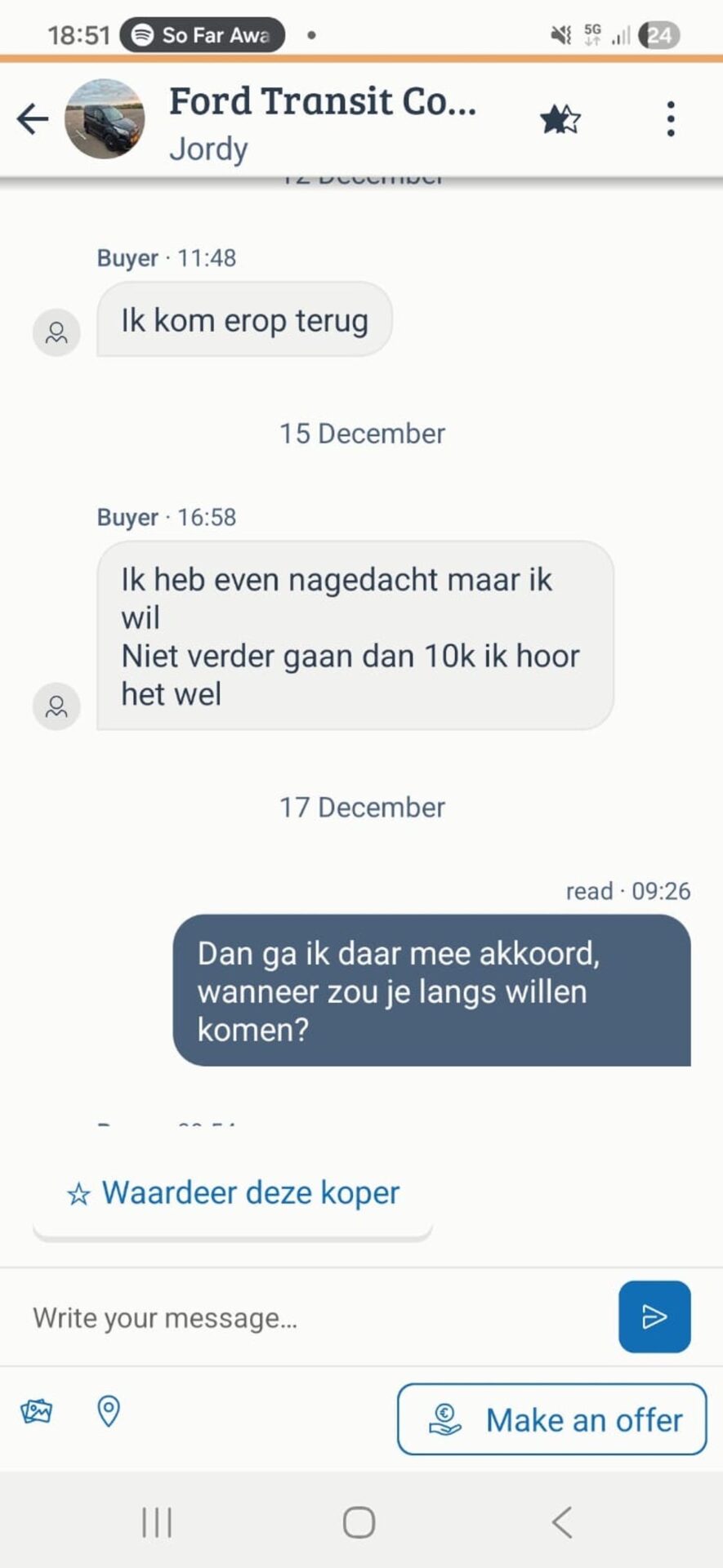 De verkoper antwoordt snel dat de auto nog beschikbaar is, maar het lijkt al snel dat de man moeite heeft om een concrete afspraak te maken. Hij stelt een paar data voor, maar krijgt telkens geen duidelijk antwoord.