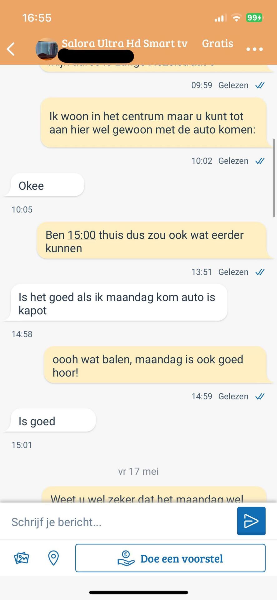 Man wil graag een smart tv komen ophalen bij iemand van Marktplaats, maar met deze beperkte manier van communiceren gaat dat nogal lastig!
