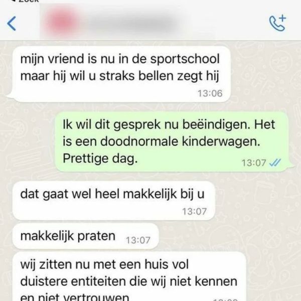 Het gesprek tussen koper en verkoper ging steeds verder van de werkelijkheid af. De koper ging zelfs zo ver om te zeggen dat hij de kinderwagen niet meer in zijn huis wilde hebben, uit angst voor de “vloek” die het met zich meebracht. In een bizarre draai van gebeurtenissen, vroeg hij zelfs om bewijs van de “goede energie” van de verkoper.