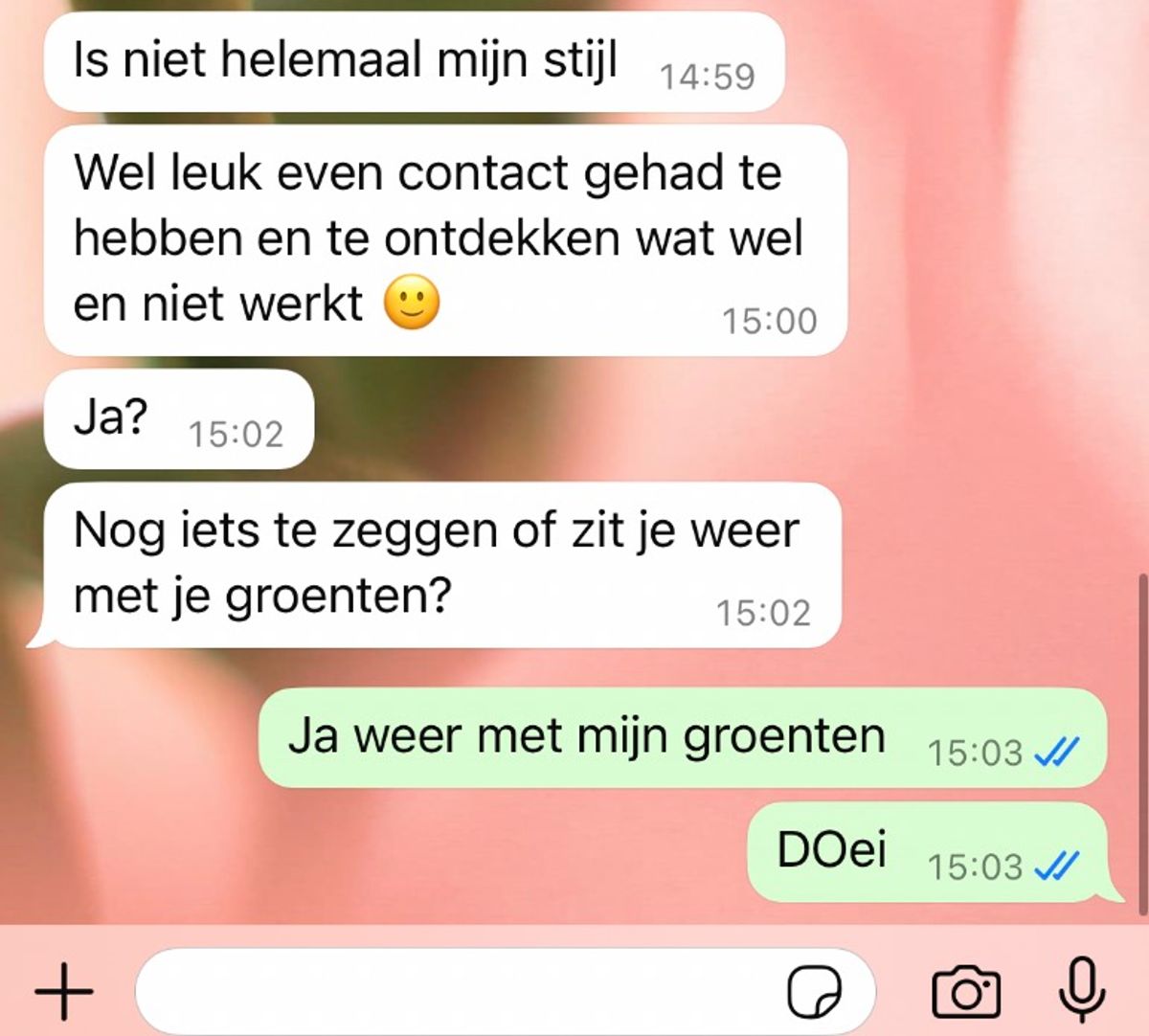 Kort daarna kwam het volgende bericht: “Zit je weer met je groenten?” De vrouw was even in de war, maar besefte snel dat hij bedoelde dat ze waarschijnlijk met eten bezig was. Zijn frustratie was duidelijk.