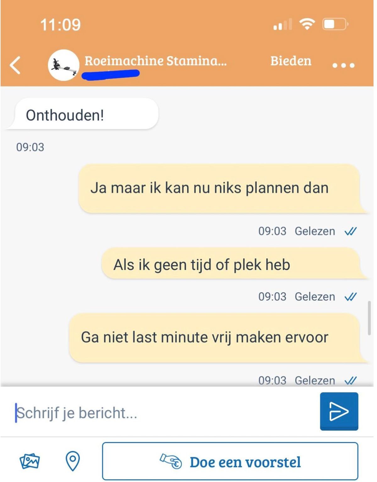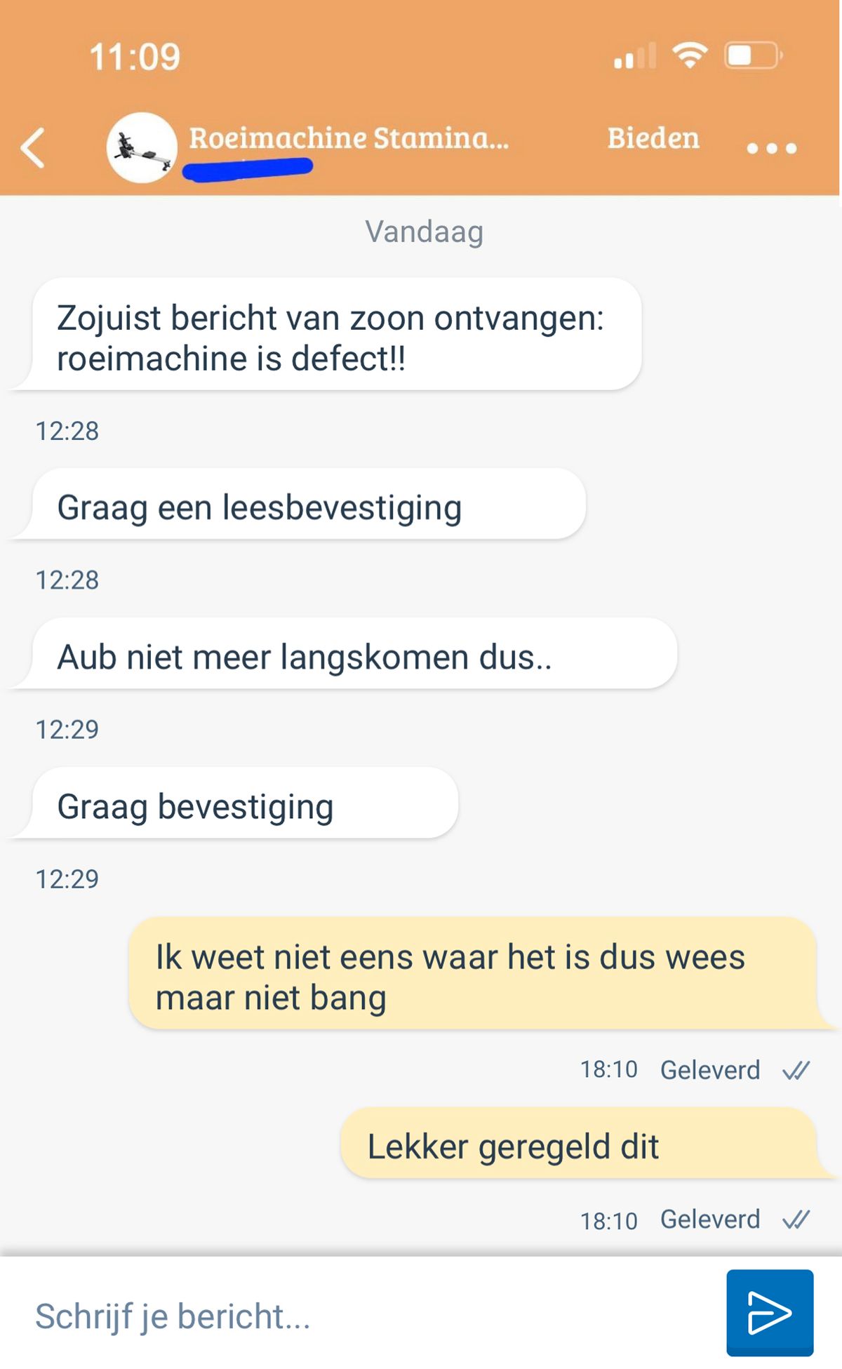 Meneer verkoopt een roeimachine via Marktplaats, maar de communicatie verloopt helaas nogal stroef!