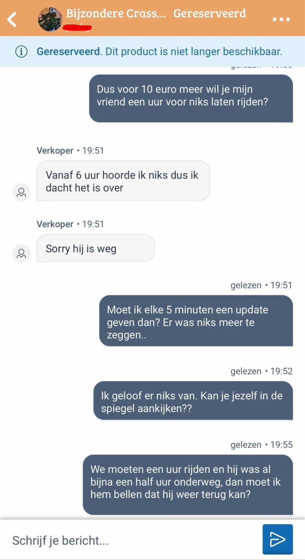 Marijke keek naar haar telefoon, volledig in de war. “Hoe kan dat?” vroeg ze zich af. De plant was nog bij haar, en Lisa zou diezelfde middag komen ophalen. Had Lisa zomaar van gedachten veranderd? Het klonk vreemd, maar Marijke besloot even af te wachten en niet meteen boos te worden. Misschien was het gewoon een misverstand.