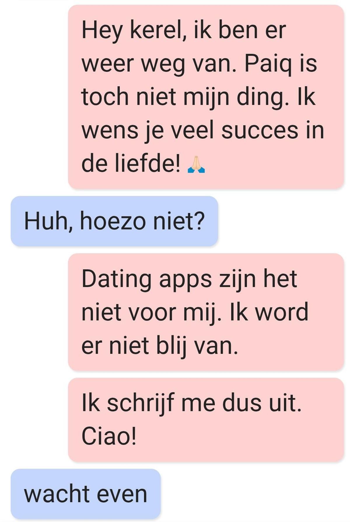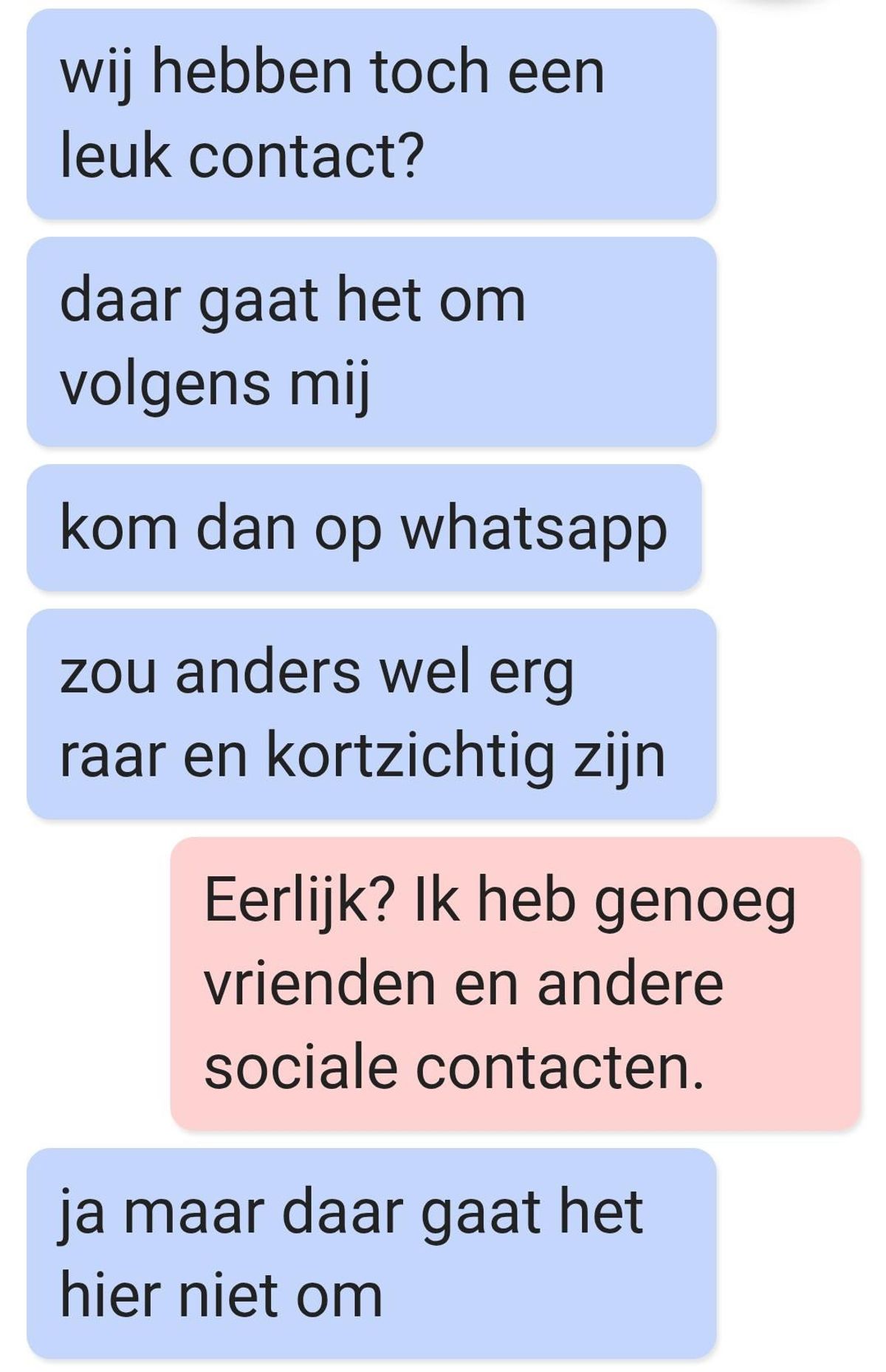 Een vrouw ontvangt een bericht van een man op een dating-app. Ze had zijn profiel kort bekeken en besloot hem vriendelijk te vertellen dat ze niet geïnteresseerd was, maar de man leek het niet te kunnen accepteren.