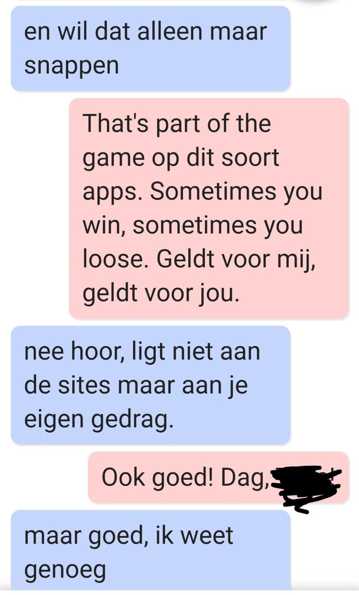 Na een paar dagen besloot ze de man te blokkeren. Het voelde misschien als een drastische stap, maar ze besefte dat haar eigen grenzen respecteren veel belangrijker was dan de valse hoop van een man die geen “nee” wilde accepteren.