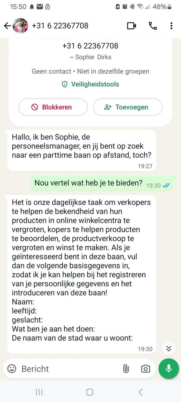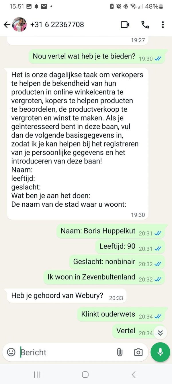 Een oplichter denkt snel geld te kunnen krijgen van een oudere dame via WhatsApp. Hij doet zich voor als haar zoon en vertelt haar dat hij in financiële problemen zit en dringend geld nodig heeft.