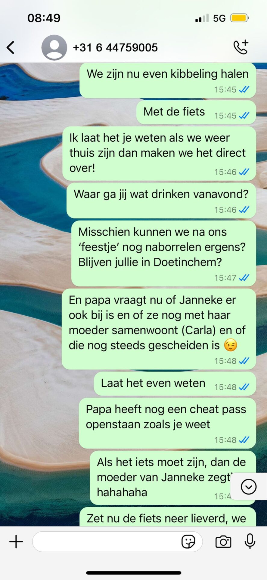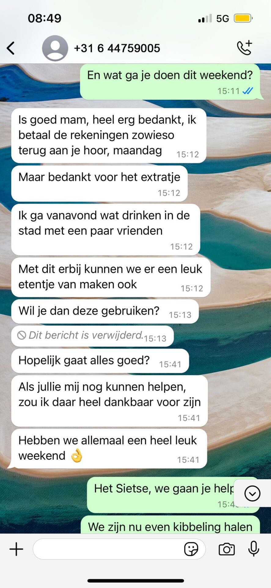 De ‘zoon’ vraagt telkens om steeds meer geld, met steeds onduidelijkere excuses. De vrouw begint nu echt te twijfelen of dit wel haar zoon is. Ze besluit een beetje subtiler door te vragen en stuurt hem een foto van haar man, hopend dat dit de situatie kan verhelderen.